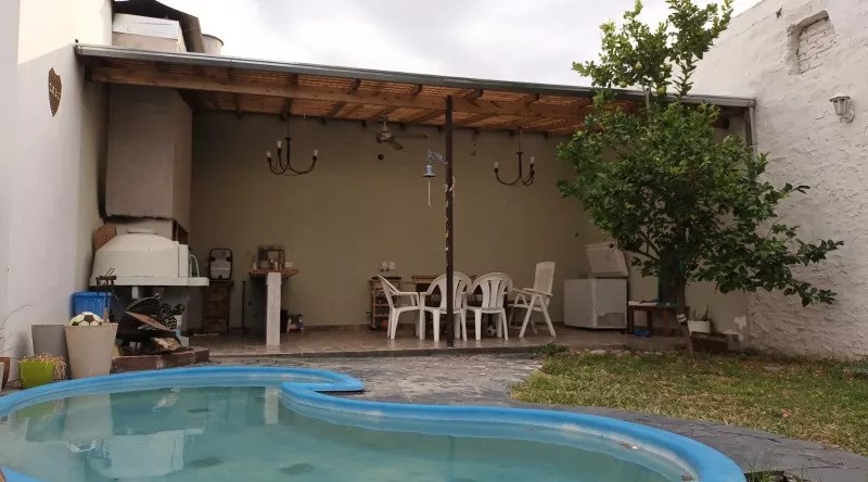 6 ambientes. Cochera cubierta para dos autos. Lote propi 8.66x44mts. Patio, quibcho con parrilla. Pileta. Amplio fondo.