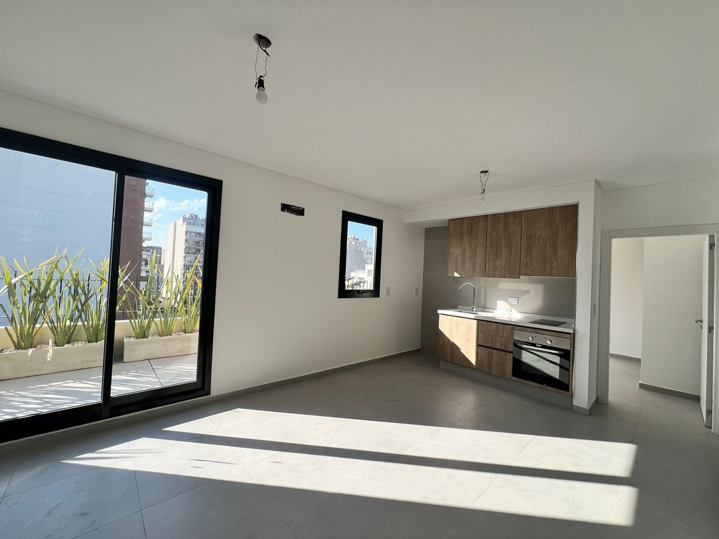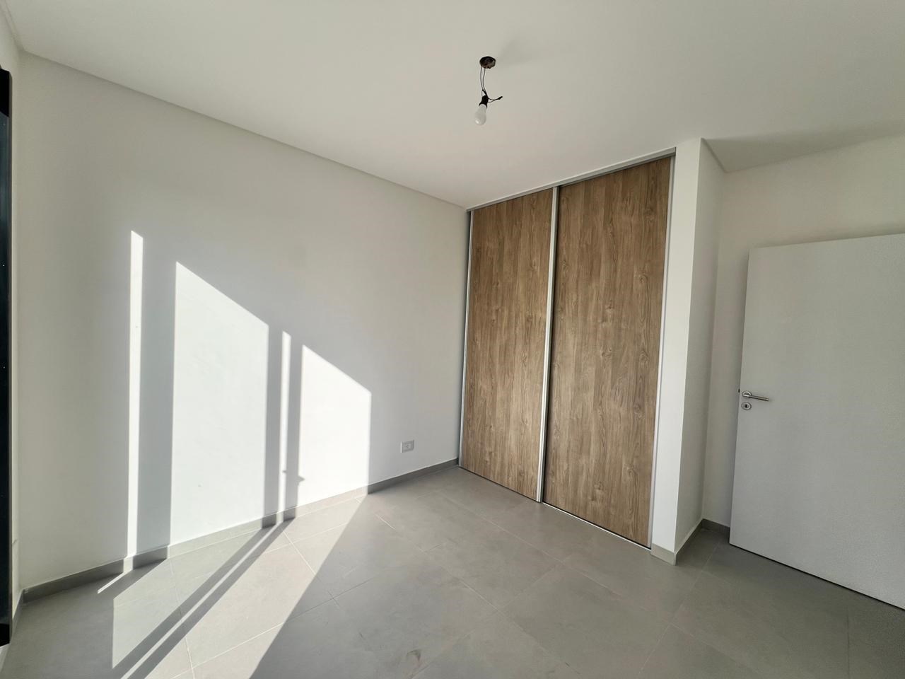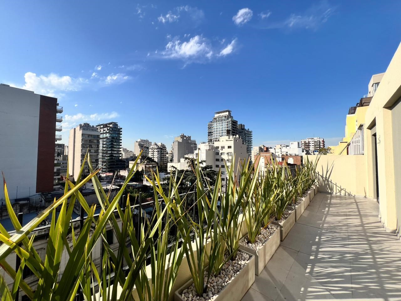 El departamento cuenta con un generoso balcón de 20 metros, con acabados en plantas y macetas que aportan un toque verde y relajante. El dormitorio es amplio y tiene salida directa al balcón, además de contar con placards empotrados para una mayor comodidad y almacenamiento.