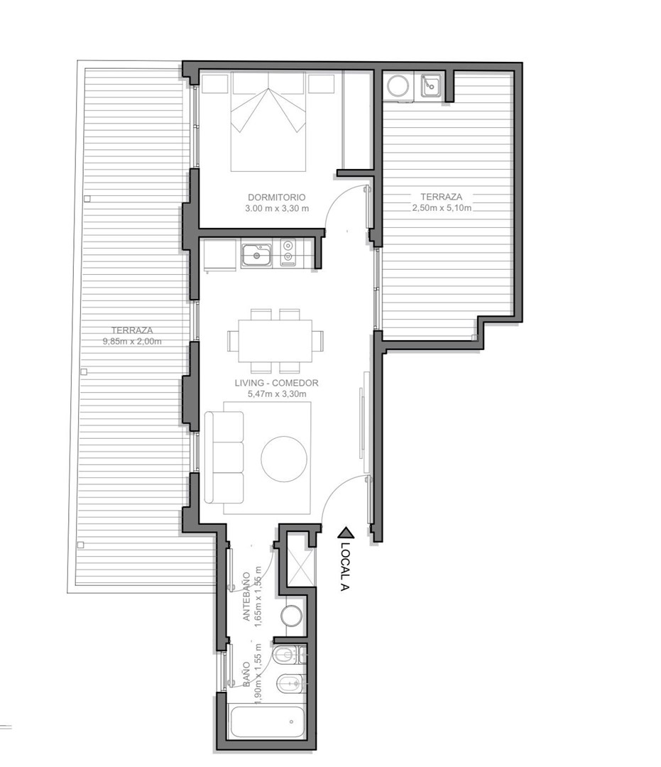 También dispone de un patio interno de 2.5 x 5.1 metros, que puede ser modificado mediante un cerramiento para convertirse en un segundo dormitorio, adaptando el espacio a tus necesidades.