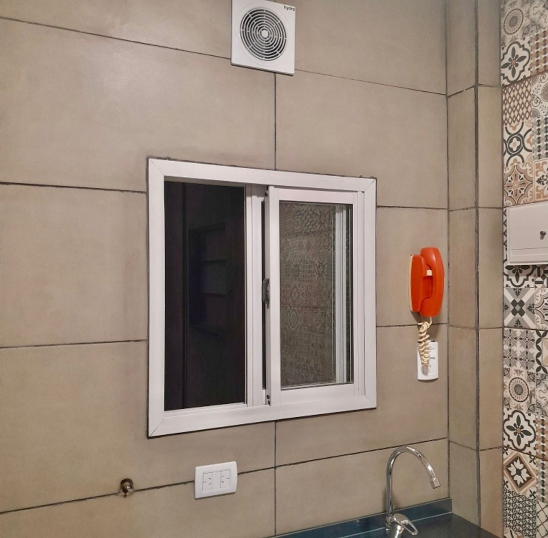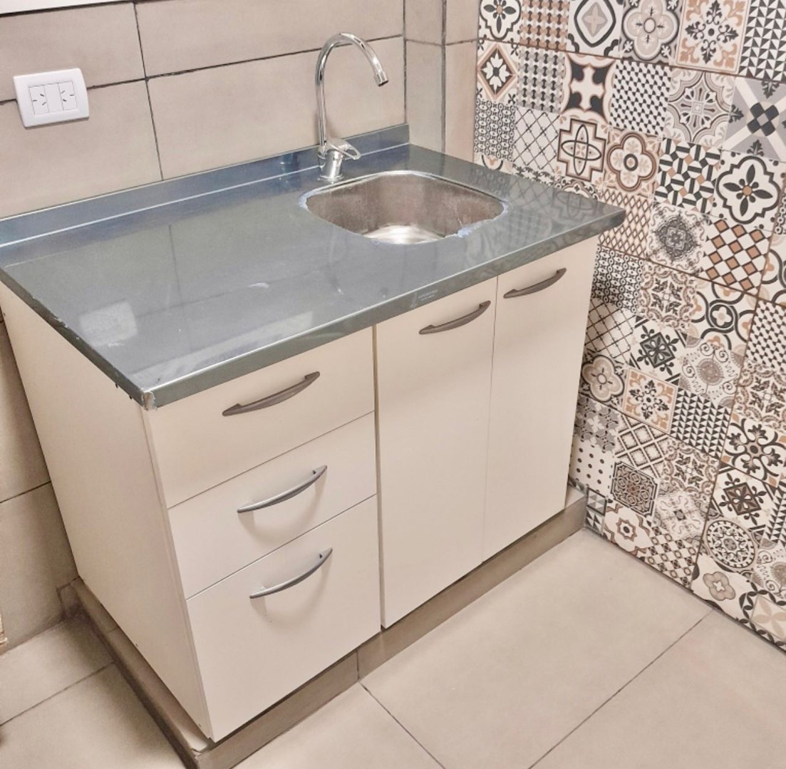 Cocina con calefon a gas, mesada de acero inoxidable nueva, monocomando, extractor de aire y conexión para lavarropas.