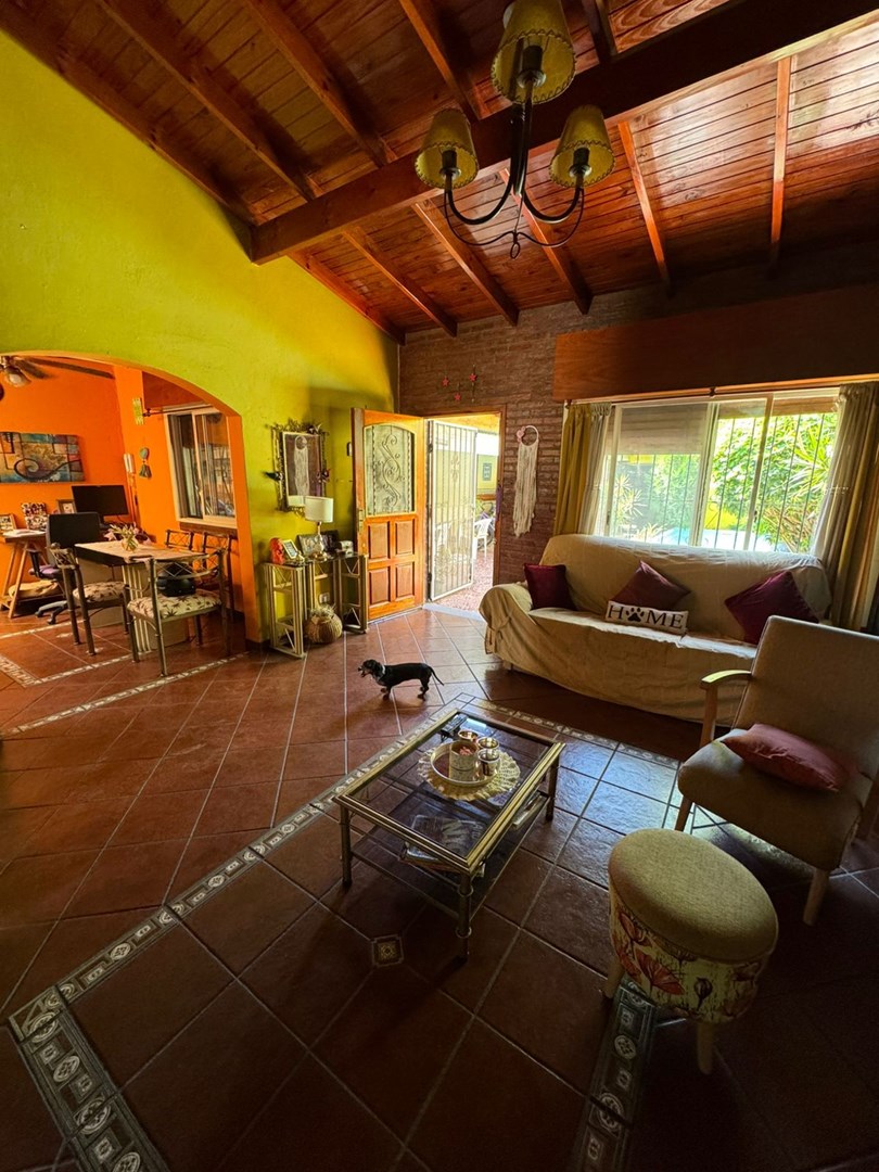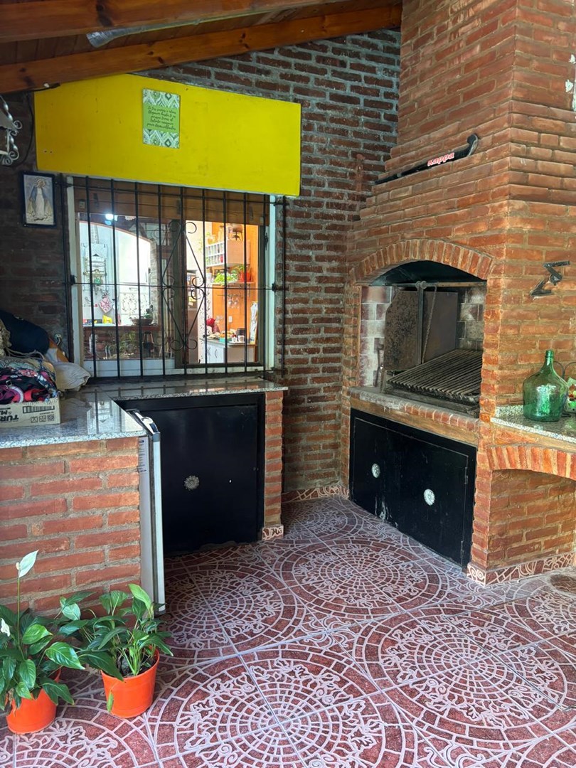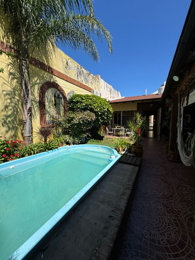 Jardín, quincho con pileta, parrilla y espacio para guardar 2 autos grandes.
