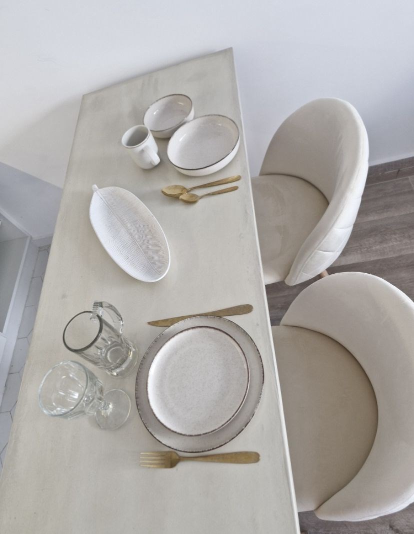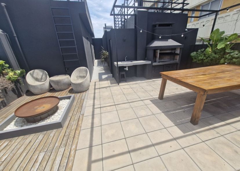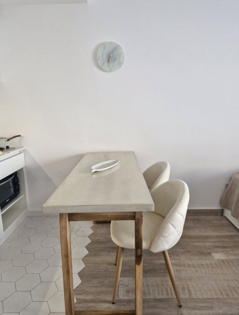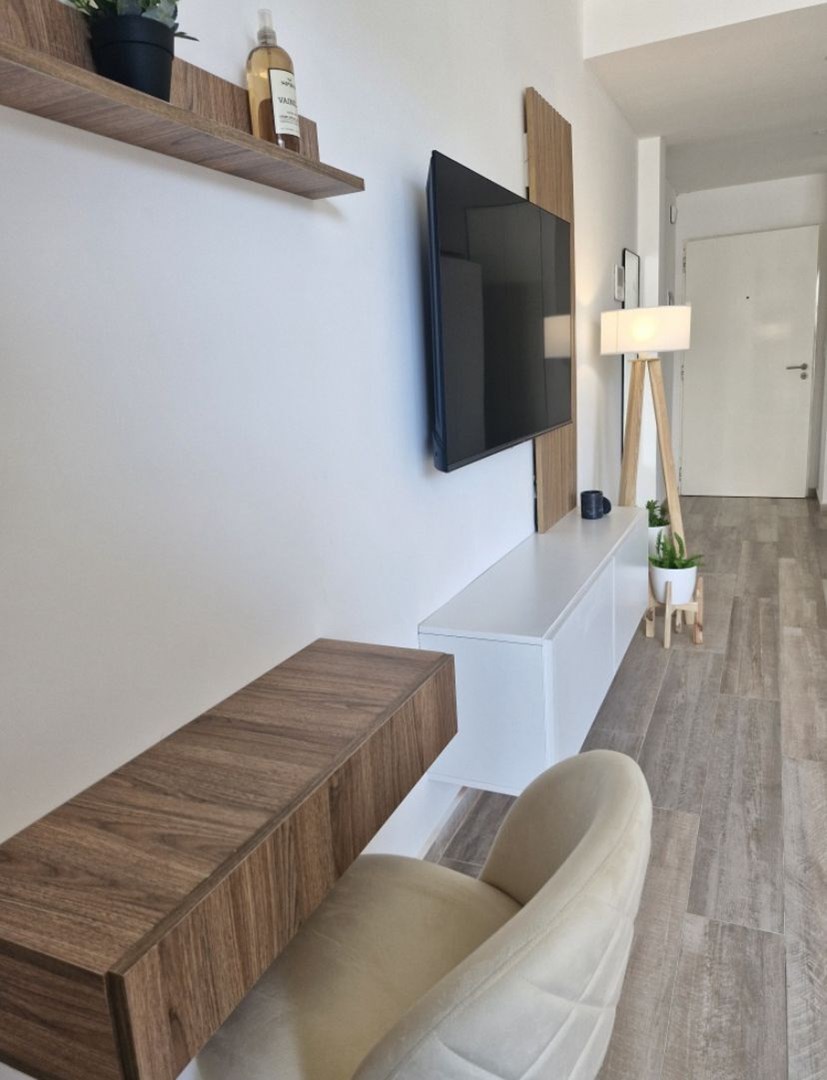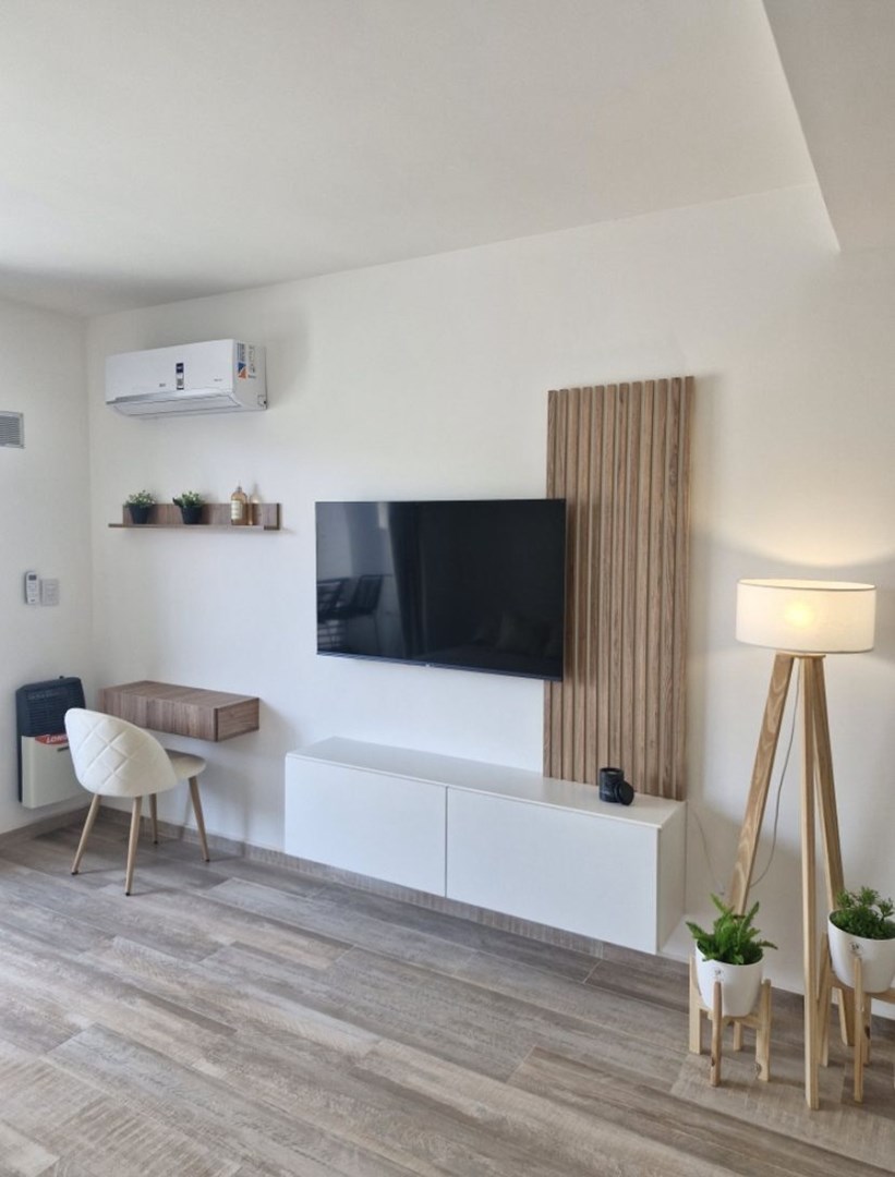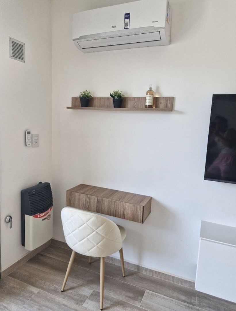 Cuenta con aire acondicionado frio/calor, Estufa, tv, heladera, microondas, anafe, pava eléctrica, cafetera nespresso, vajilla, sommier con colchón de 2 plazas, mesa con sillas, banquetas del balcón y muebles de diseño.