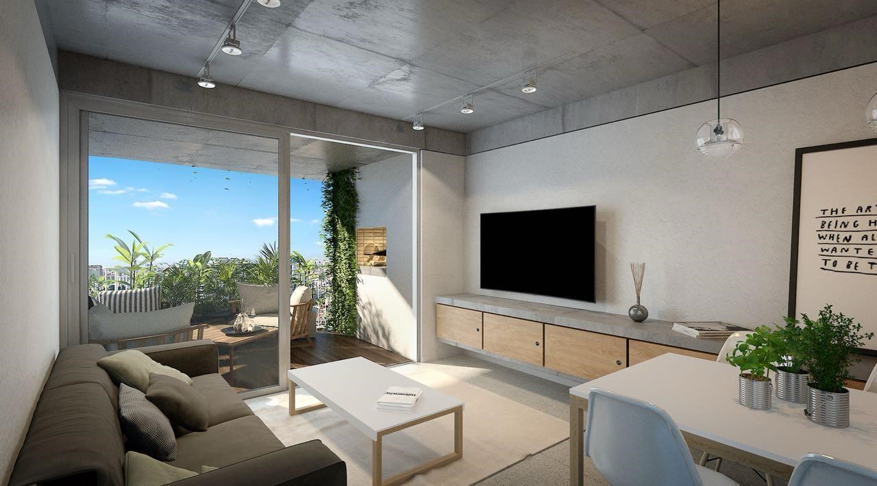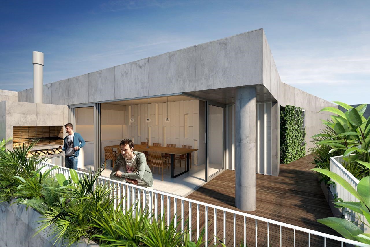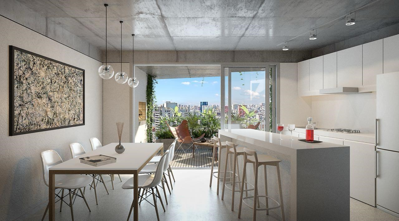 Unidades de 2 ambientes de 43m2 totales con 2 baños y balcón aterrazado.