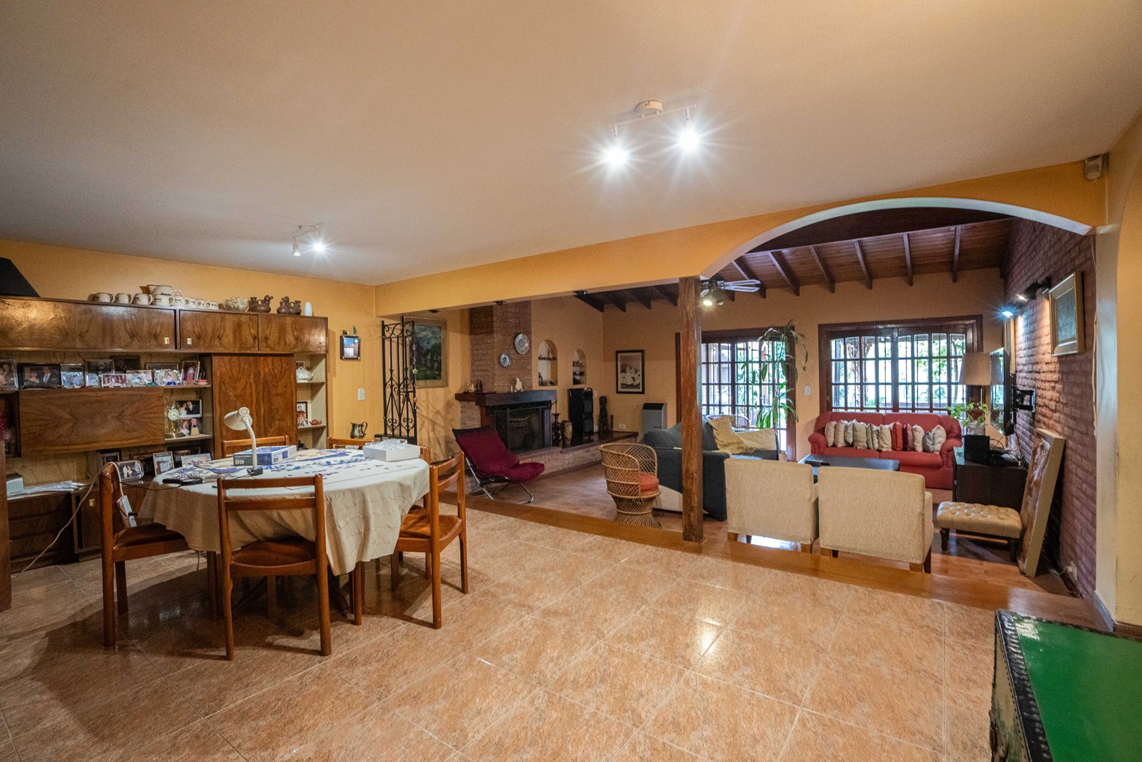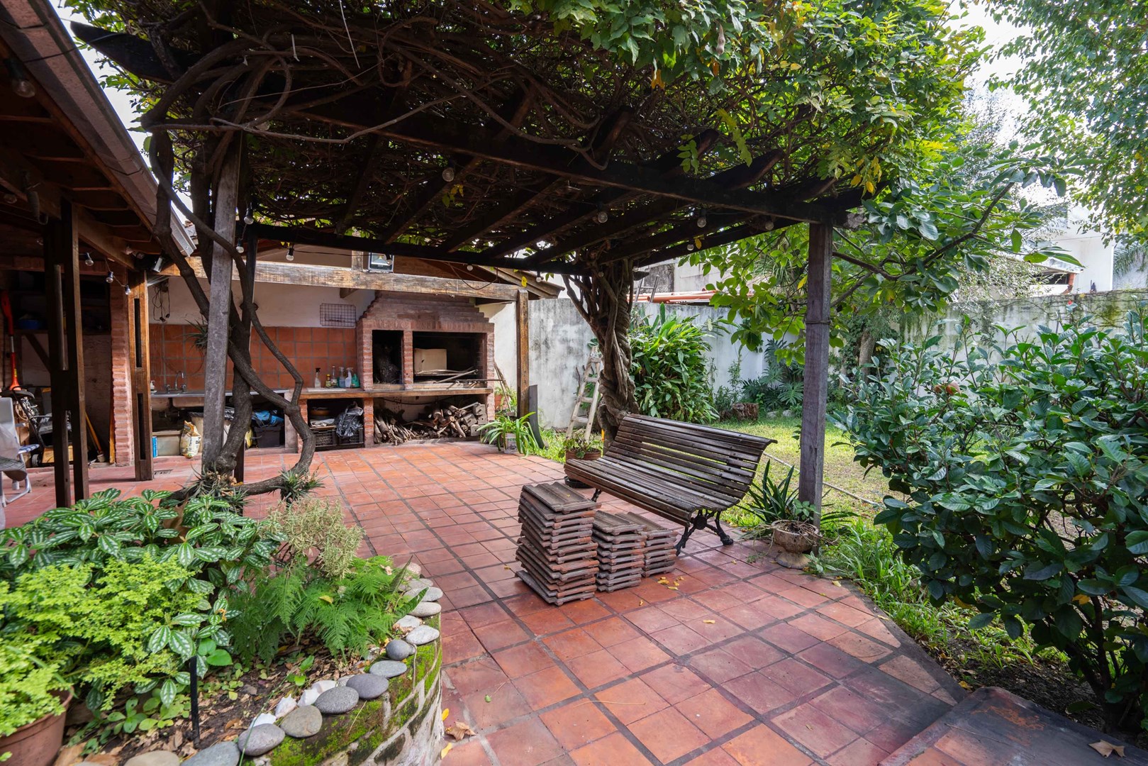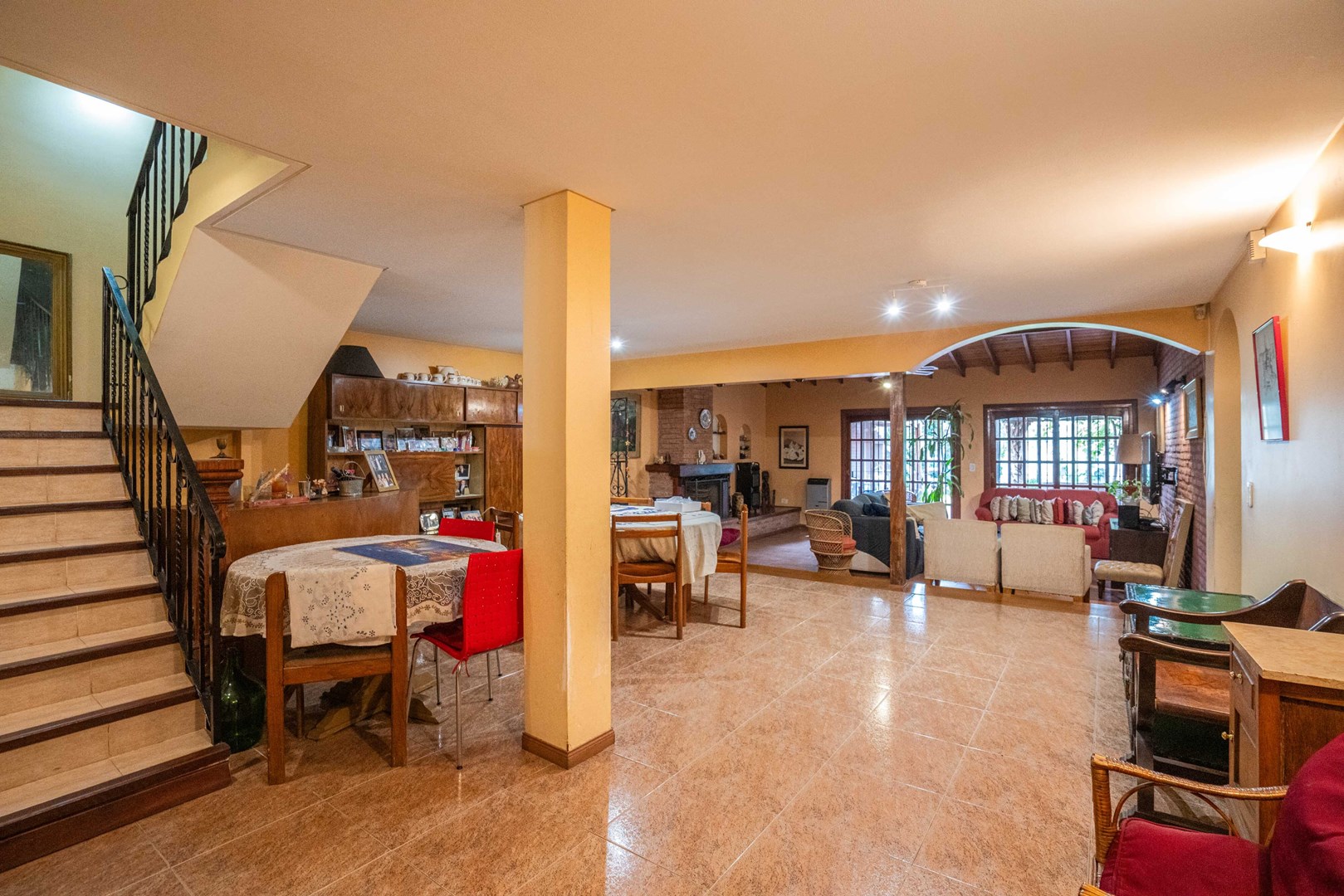 En planta baja se encuentra un amplísimo living y comedor con hogar a leña, escritorio o dormitorio adicional, toilette, cocina con comedor diario y lavadero incorporado. Desde esta planta se accede al jardín, que cuenta con una encantadora galería y parrilla. Cochera cubierta para un vehículo.