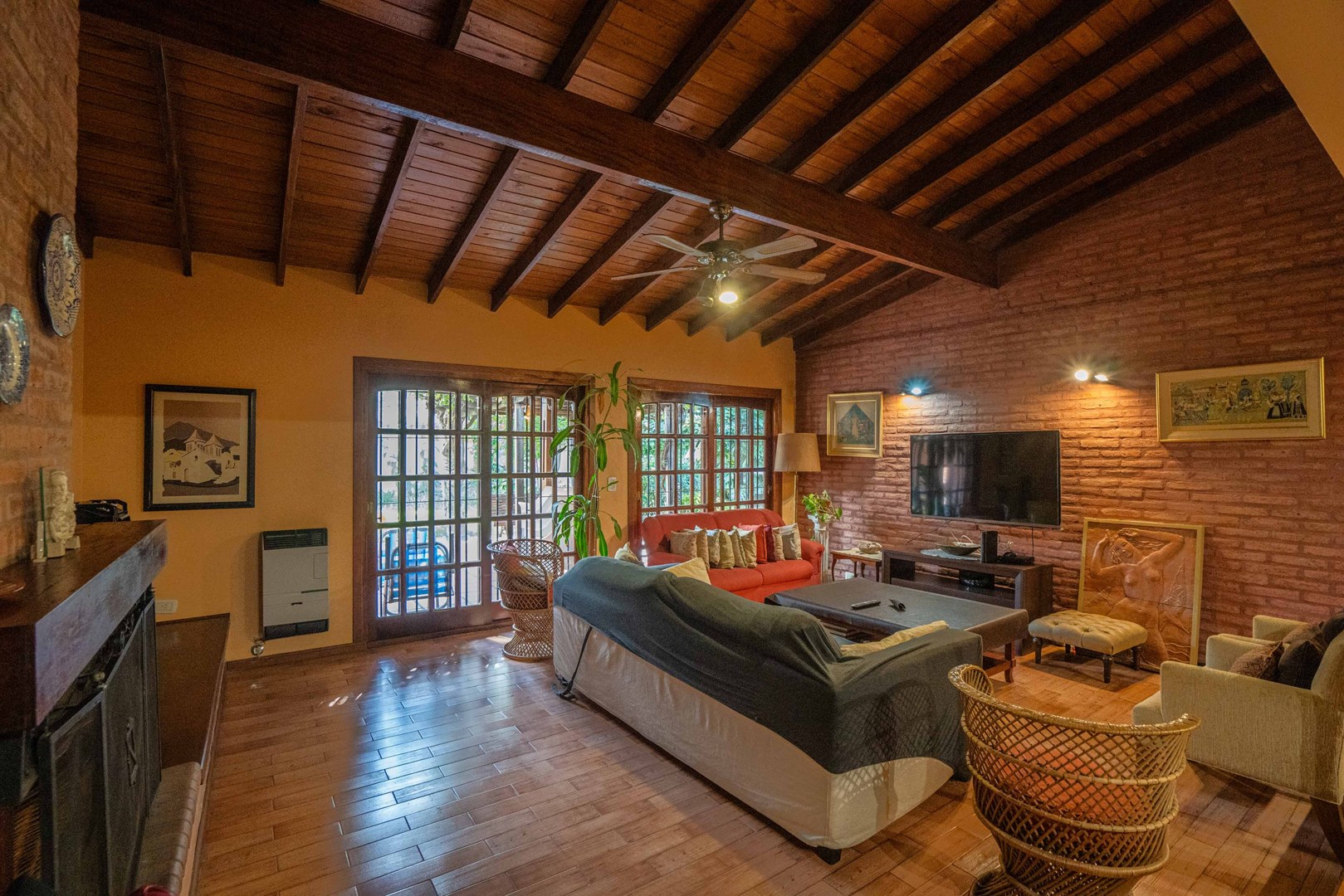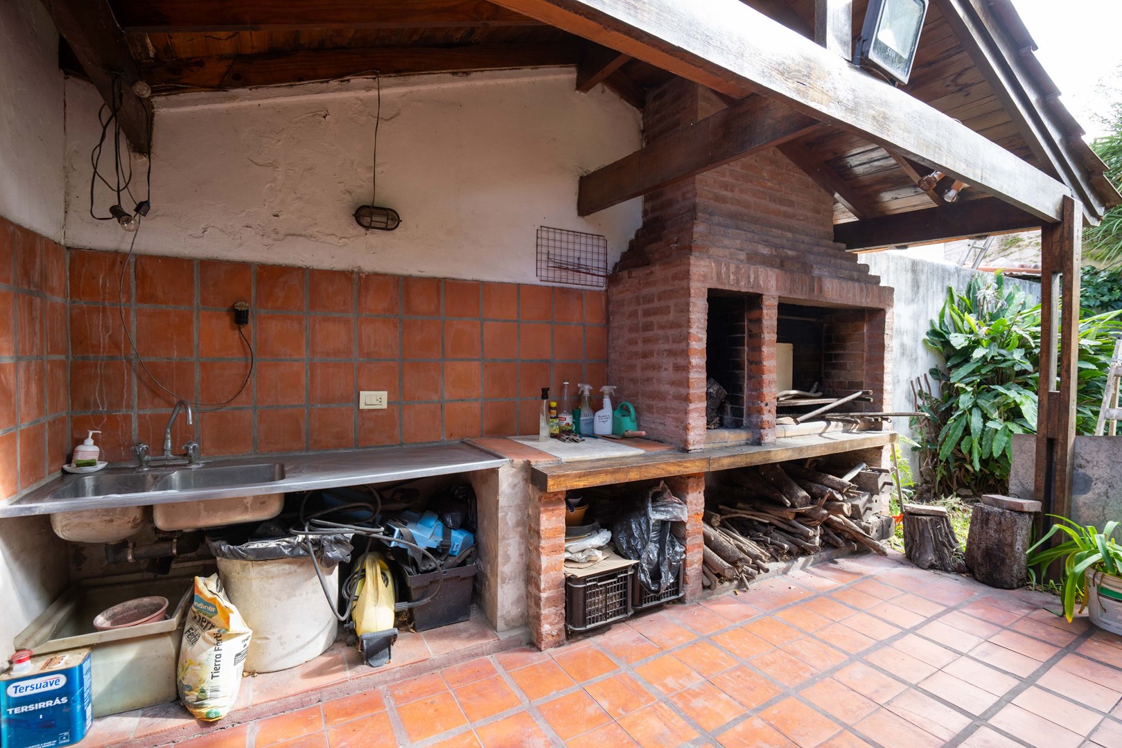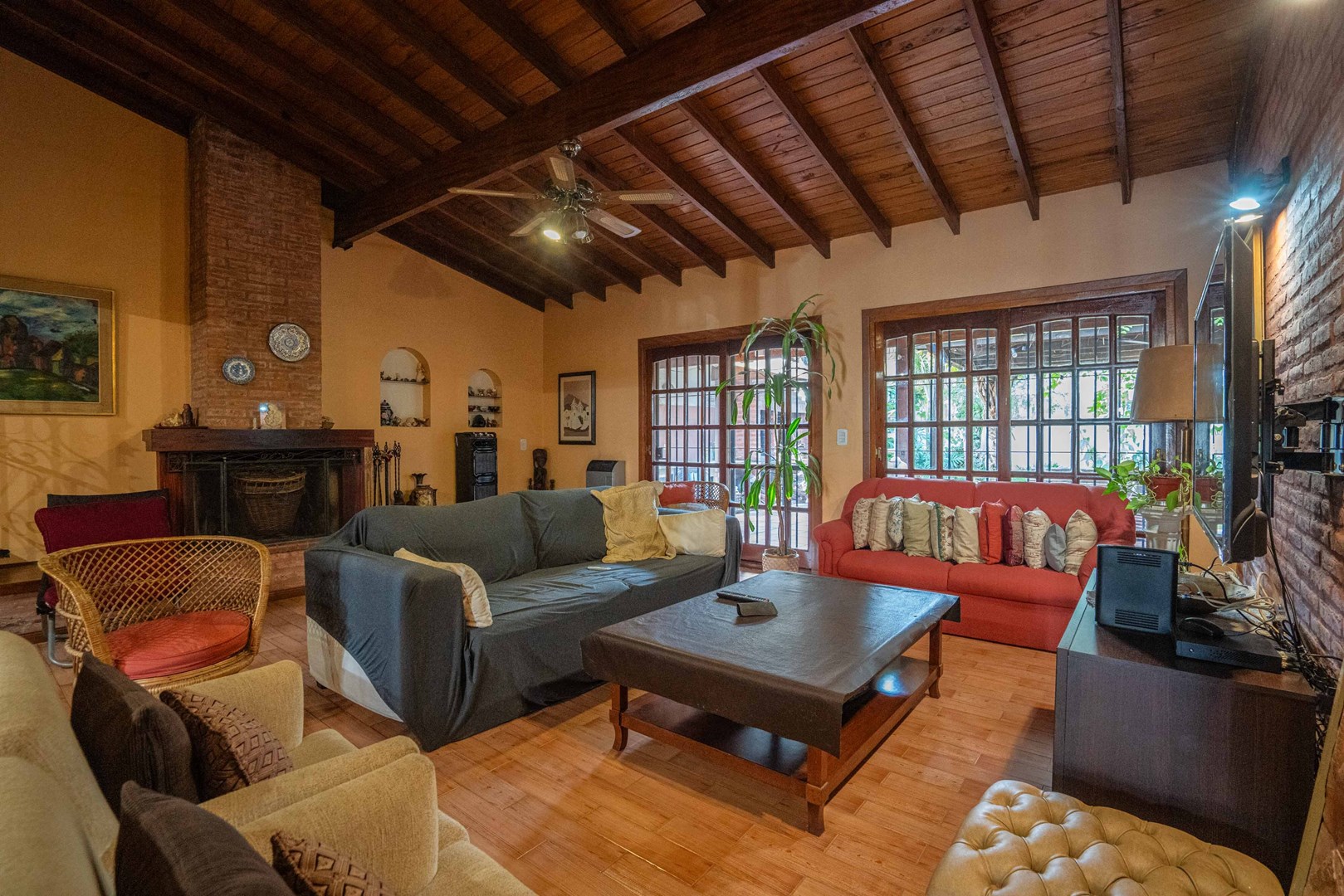 En planta baja se encuentra un amplísimo living y comedor con hogar a leña, escritorio o dormitorio adicional, toilette, cocina con comedor diario y lavadero incorporado. Desde esta planta se accede al jardín, que cuenta con una encantadora galería y parrilla. Cochera cubierta para un vehículo.