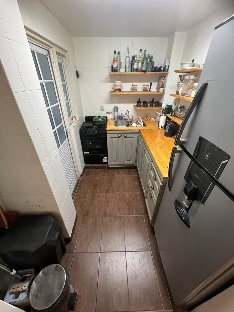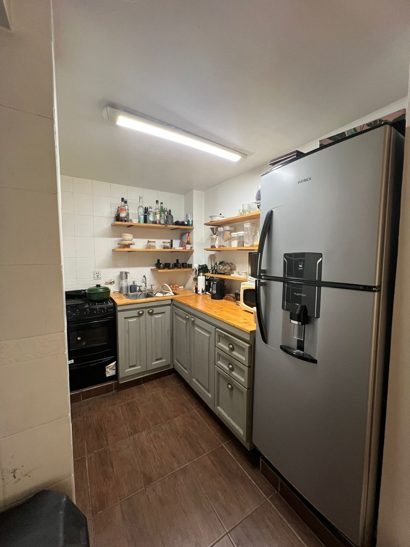 Cocina funcional con mesada en L, conexión a un patio interno y al living comedor