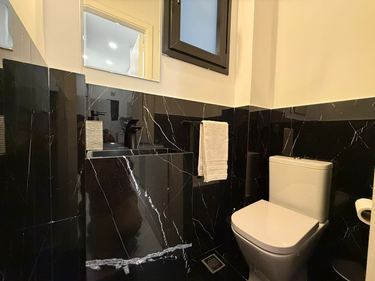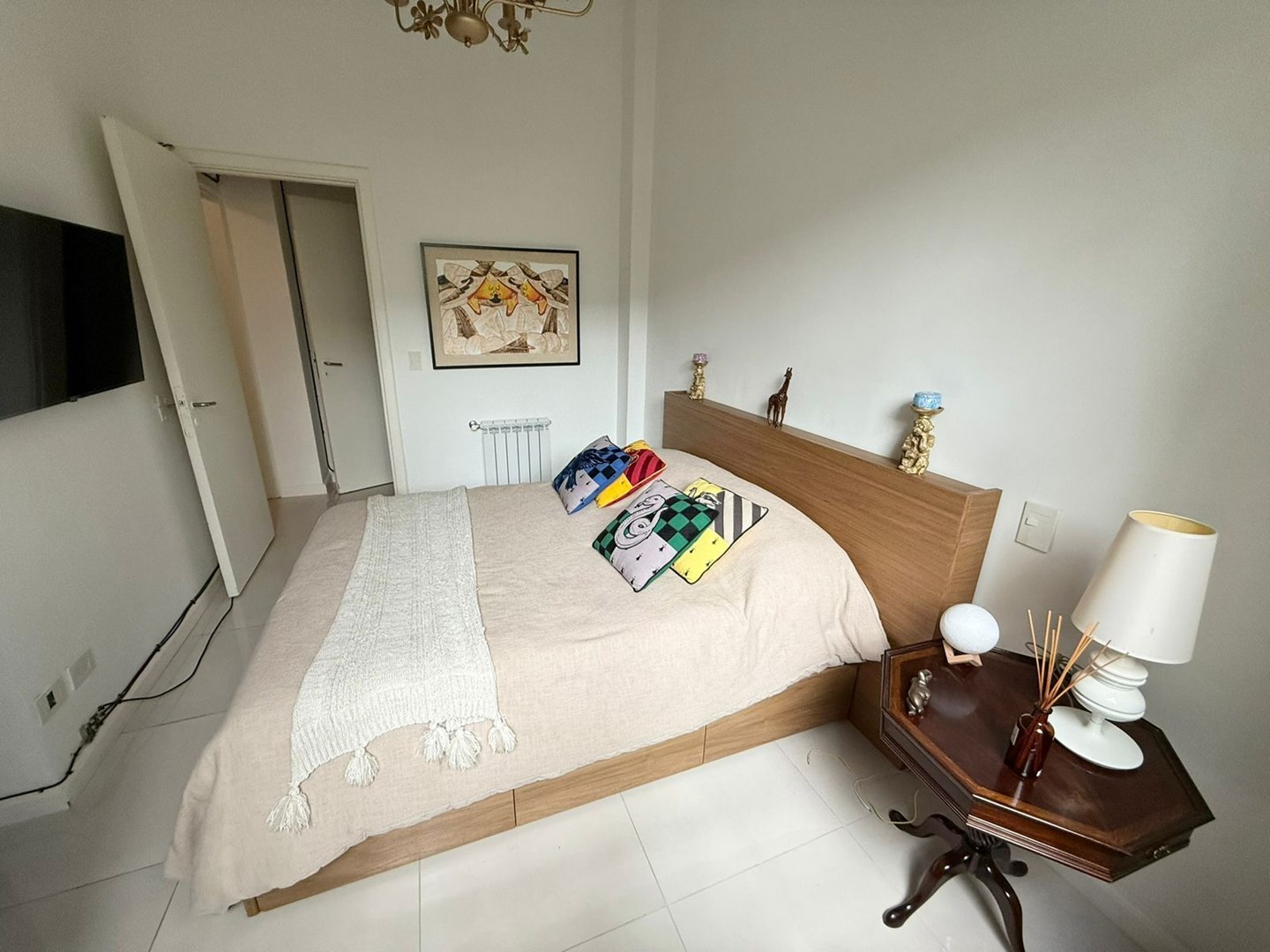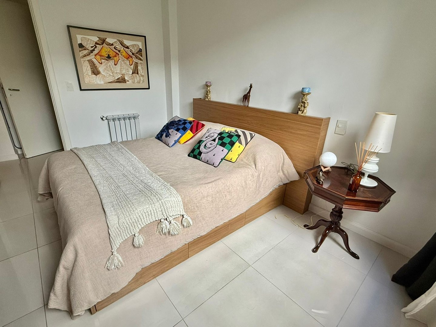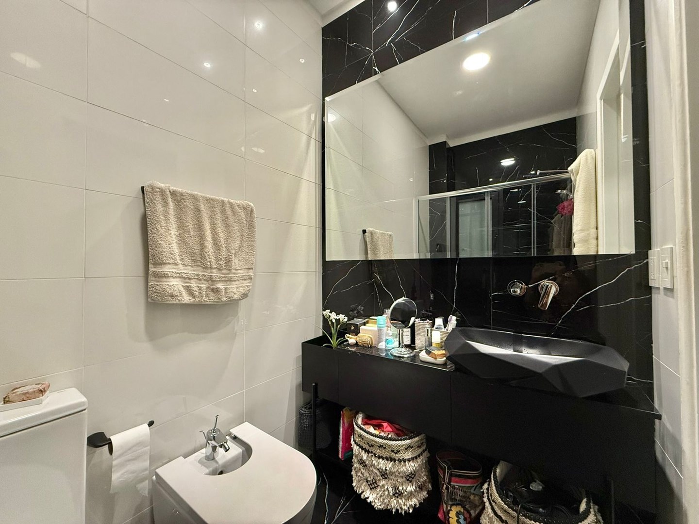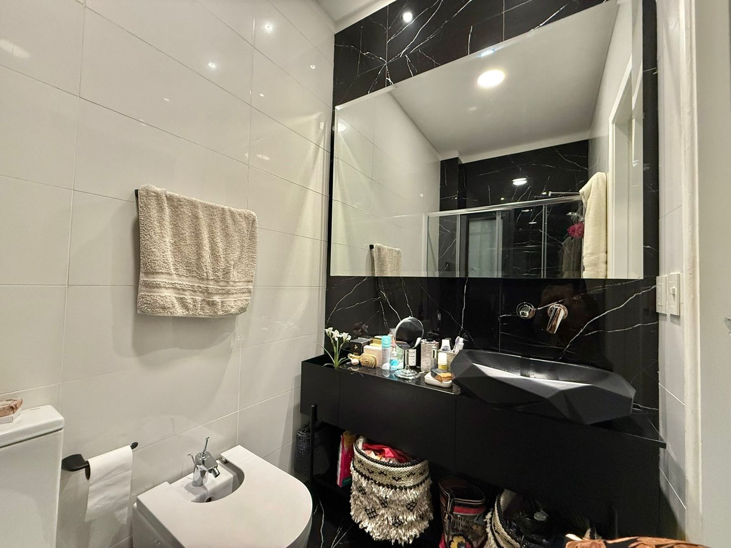 El dormitorio es amplio y cómodo, con vestidor hecho a medida de piso a techo y escalera interna, gracias a una destacada altura de techos de 4,25 metros. El baño principal es moderno y funcional, con griferías alemanas, sanitarios europeos Roca Inspira y ducha a estrenar. Además, cuenta con un toilette adicional con bacha de mármol a medida.