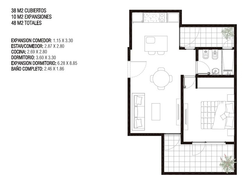 Expansiones: balcón y terraza totalizando 10 m2