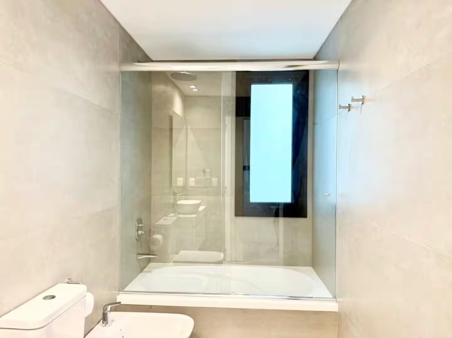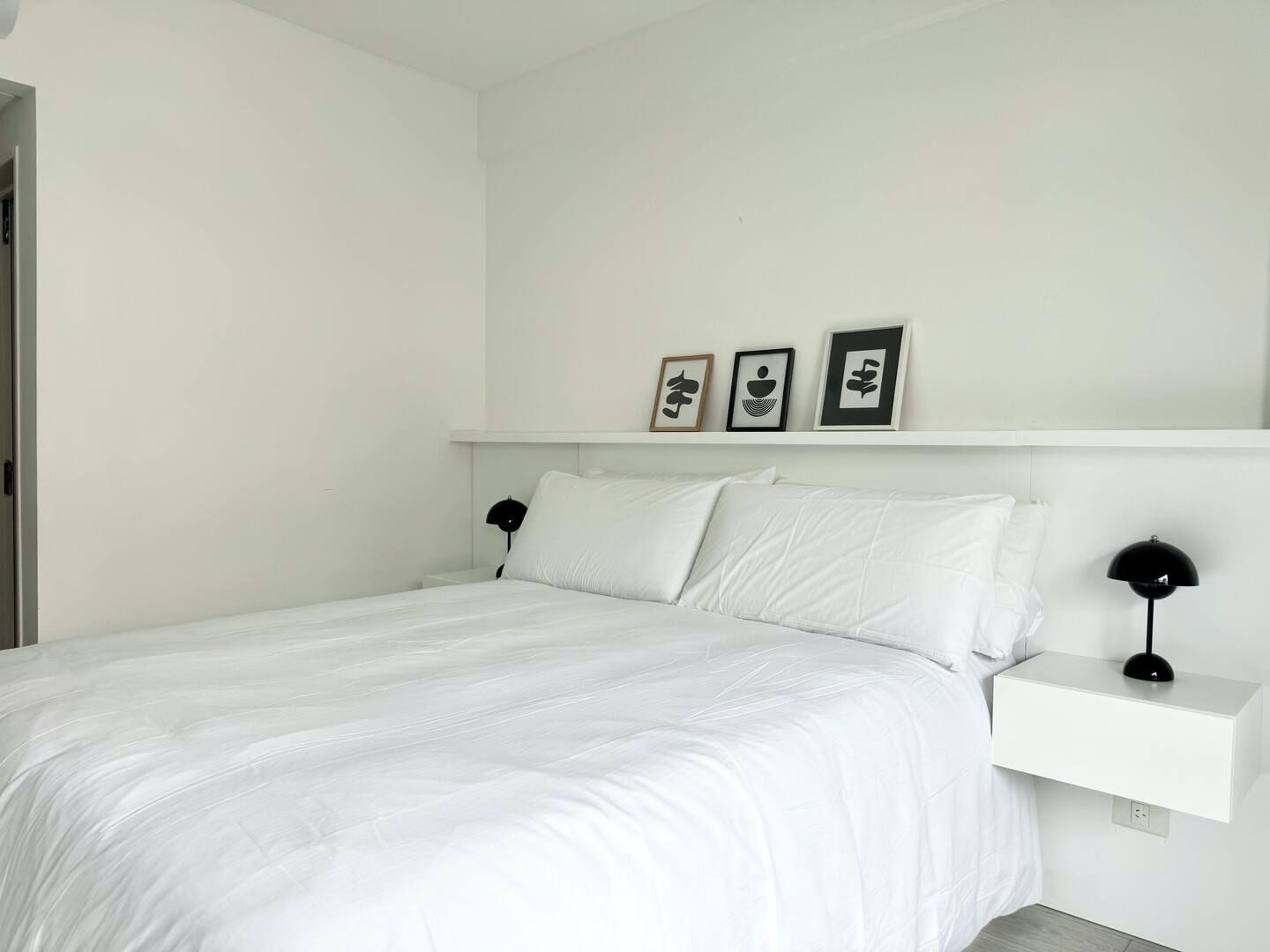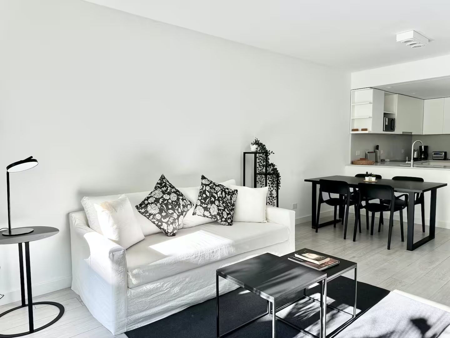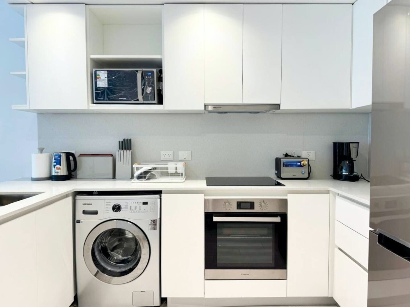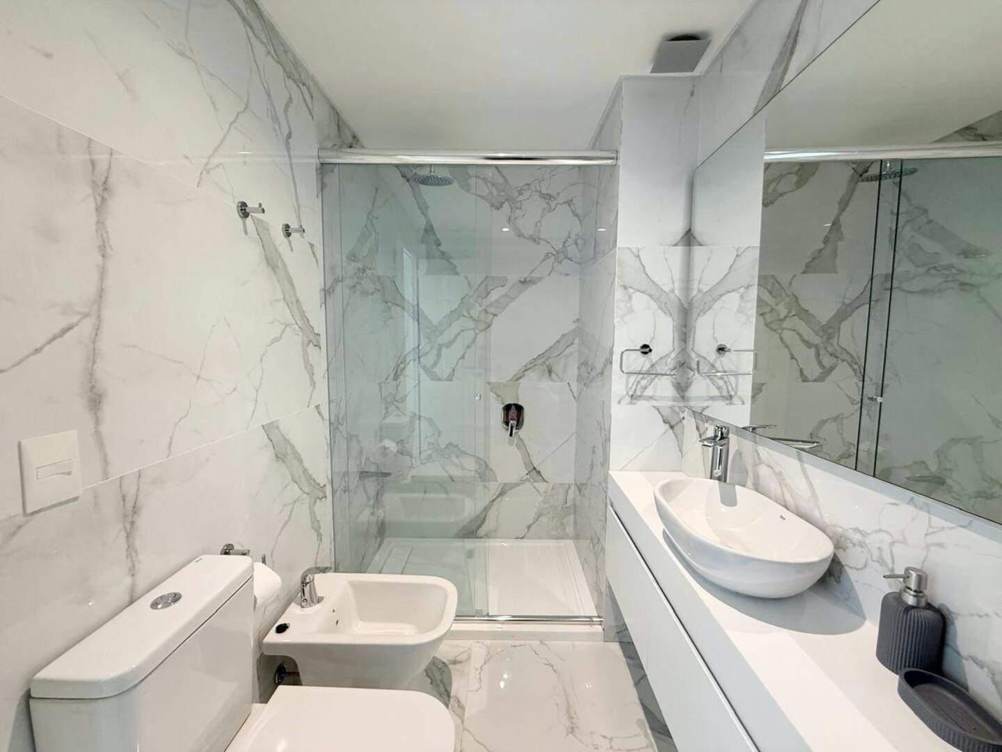 La unidad cuenta con 3 ambientes distribuidos en 2 dormitorios, ambos con cama matrimonial. Posee 2 baños completos, cocina equipada con electrodomésticos modernos, living comedor con sofá y mesa de comedor, además de lavarropas. El dormitorio principal cuenta con televisor, al igual que el área de estar.
