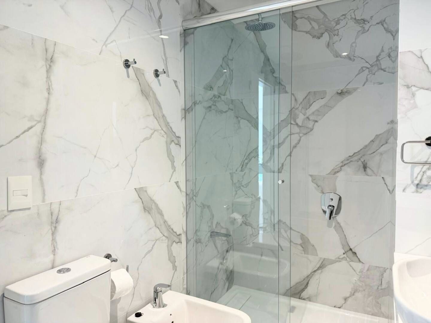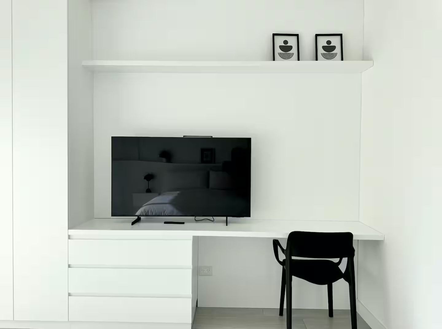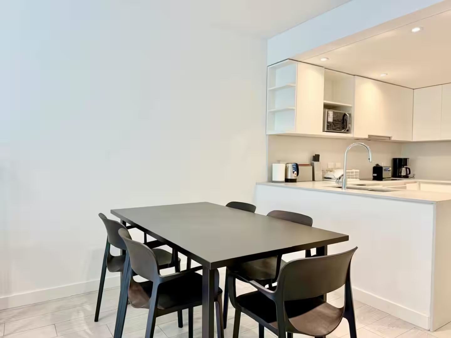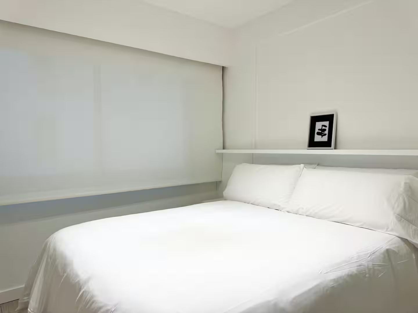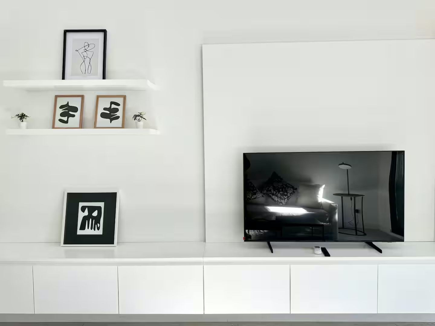 La unidad cuenta con 3 ambientes distribuidos en 2 dormitorios, ambos con cama matrimonial. Posee 2 baños completos, cocina equipada con electrodomésticos modernos, living comedor con sofá y mesa de comedor, además de lavarropas. El dormitorio principal cuenta con televisor, al igual que el área de estar.