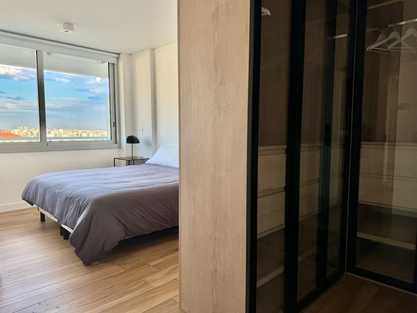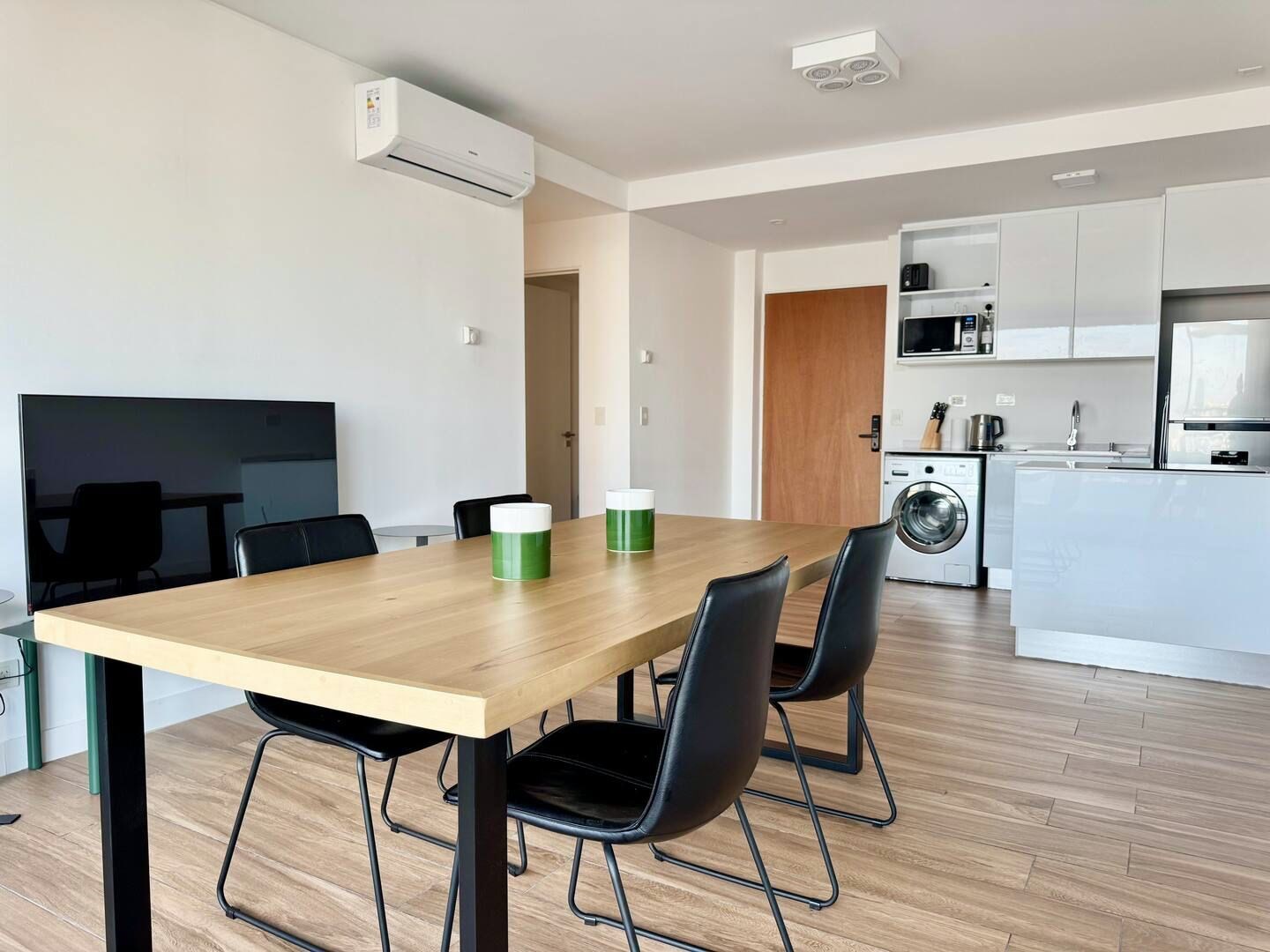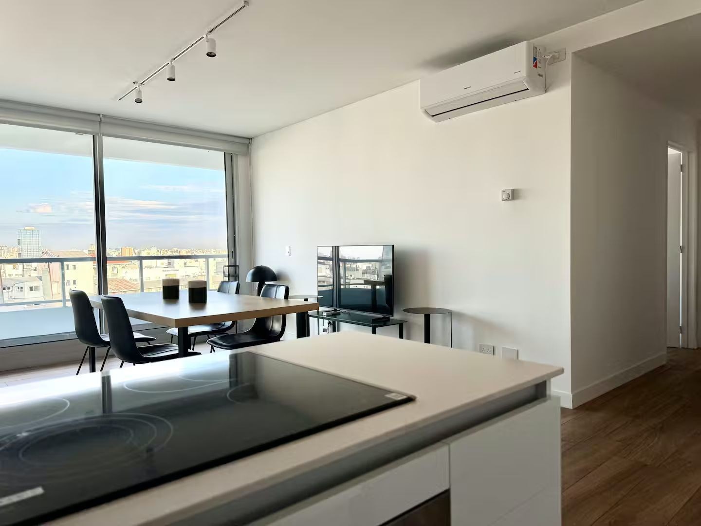 El departamento se compone de 3 ambientes distribuidos en dos plantas. Cuenta con dos dormitorios, el principal en suite con vestidor y baño completo, un segundo dormitorio con amplias vistas, un segundo baño completo y un toilette. La cocina se encuentra totalmente equipada y dispone de un comedor y una sala de estar con televisión. La unidad incluye lavarropas y cochera.