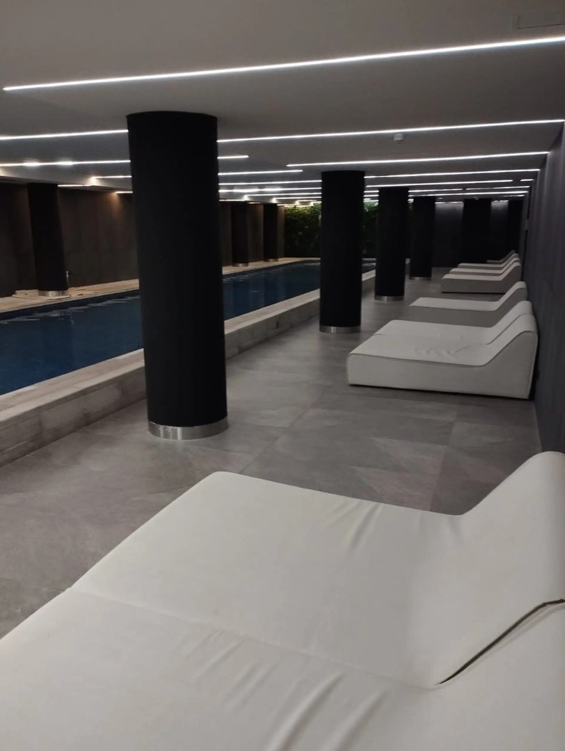 Pileta semiolímpica cubierta con duchas, baño completo y sala de masajes.