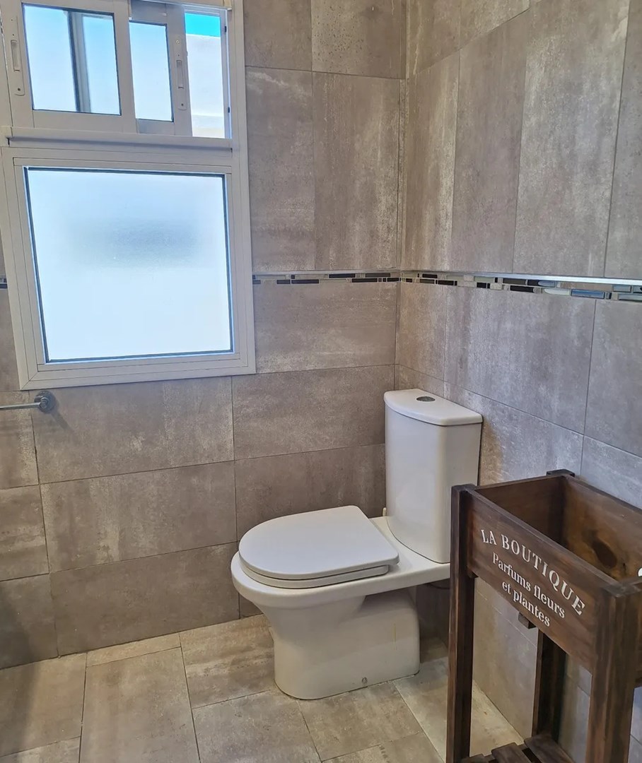 Baño principal con grifería FV, mampara de vidrio, deck de madera e inodoro Ferrum