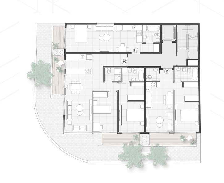 Del 1er piso al 4to piso hay 3 departamentos por piso. En el 5to piso hay un 2 ambientes y una unidad particular que ocupa 6to y 7mo piso con acceso exclusivo a la terraza.