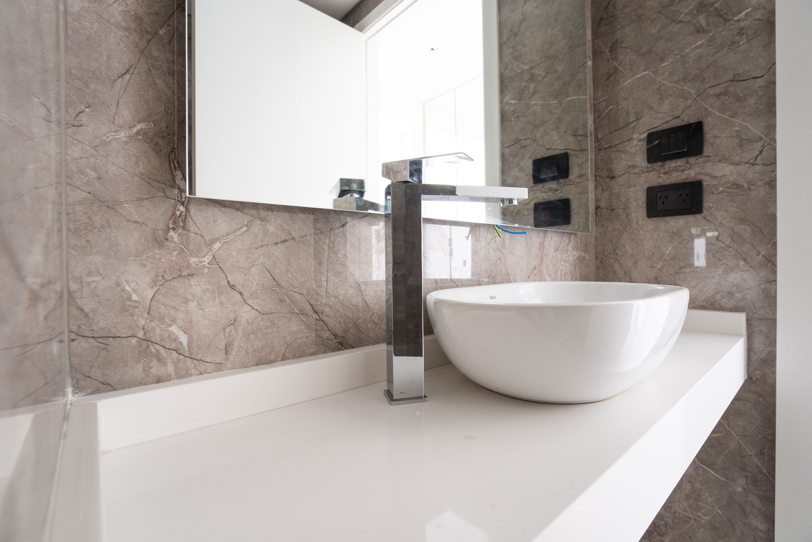 El departamento presenta terminaciones de vanguardia, incluyendo mesada y alzada de Silestone, anafe y horno eléctrico marca Ariston, y extractor integrado en la cocina. Dispone de un baño completo de diseño con espejos, grifería FV o similar, más un toilette en el living. Los placares son completos con puertas espejadas.