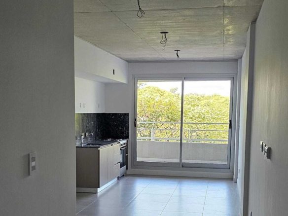 Incluye hall de entrada, ambiente principal general, living comedor integrados, un toilette, y un baño con box ducha de 1,20×0,80. La cocina posee doble mesada con horno eléctrico y anafe por inducción, bajo mesada de guardado y espacio para heladera. También tiene lavadero separado con espacio para lavarropas y secarropas. Este nivel se completa con muebles de guardado en el hall de entrada y living.