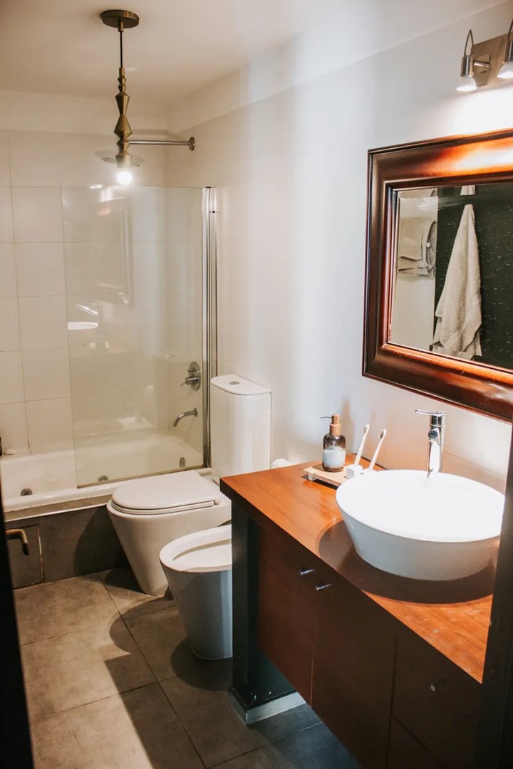 Entre sus detalles de calidad se destacan pisos Patagonia Flooring, sanitarios Ferrum, griferías FV, mampara de vidrio templado, puertas blindadas en ambos accesos y calefón Orbis de encendido electrónico.