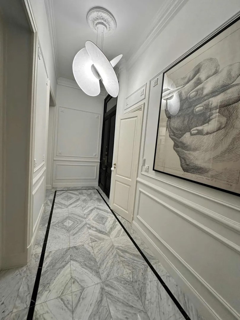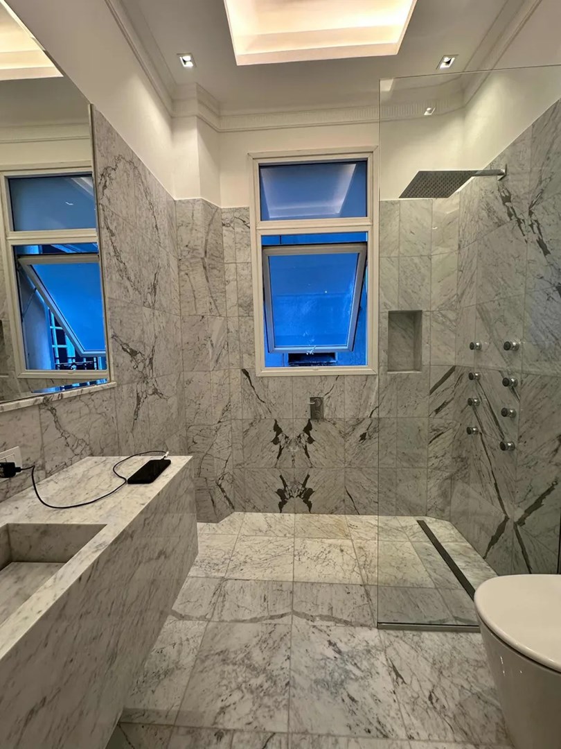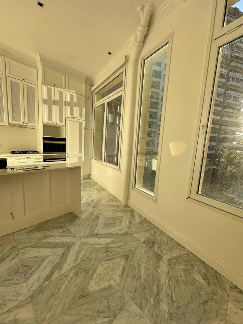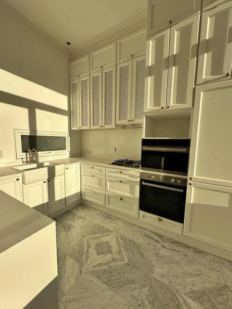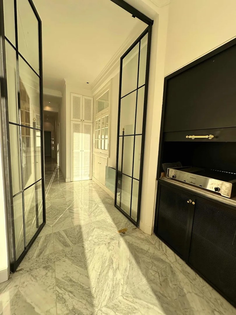 La unidad cuenta con materiales 100% importados y terminaciones de ultra categoría. Incluye pisos de mármol de Carrara traído de Italia y roble francés en los ambientes principales. La cocina premium posee heladera empotrada y persianas automáticas. Además, dispone de una parrilla Tromen a gas y tres baños, dos de los cuales están equipados con ducha escocesa e hidromasaje vertical.