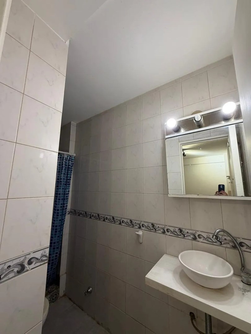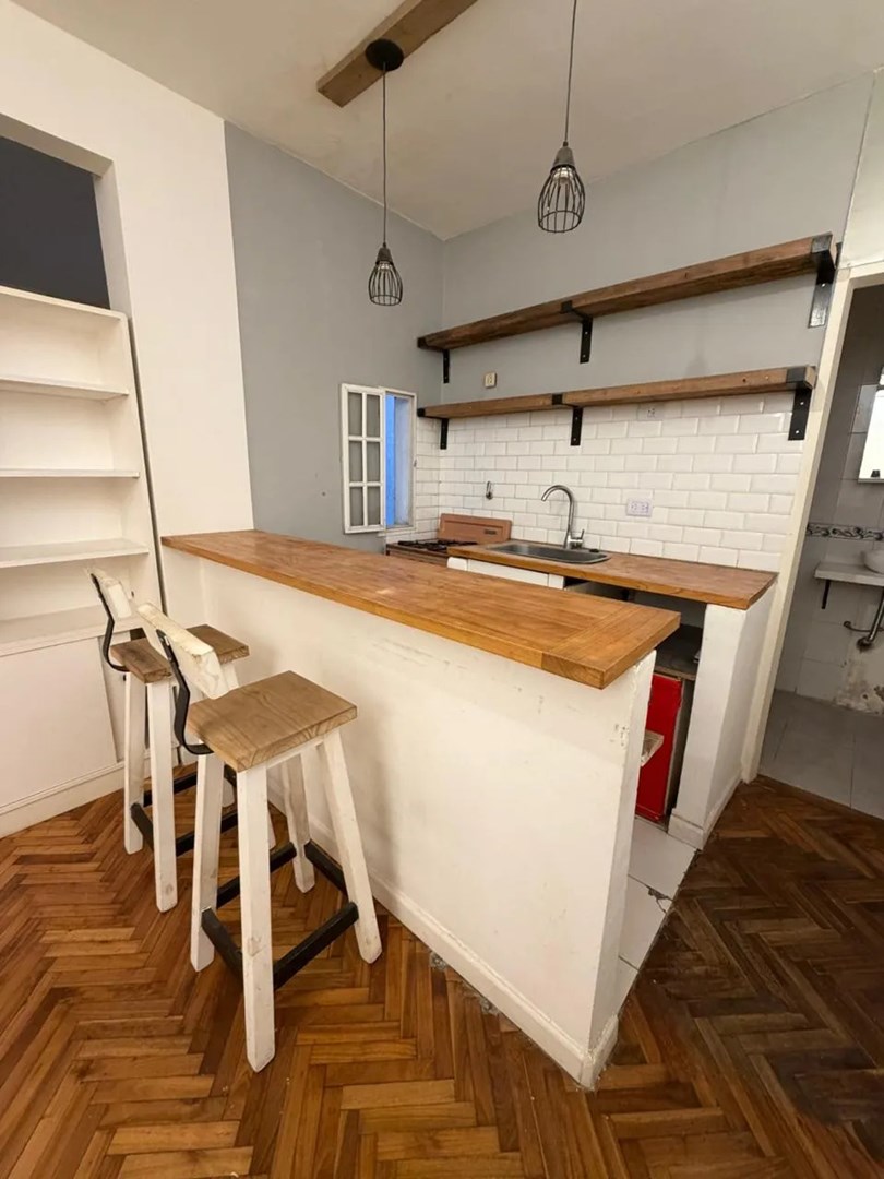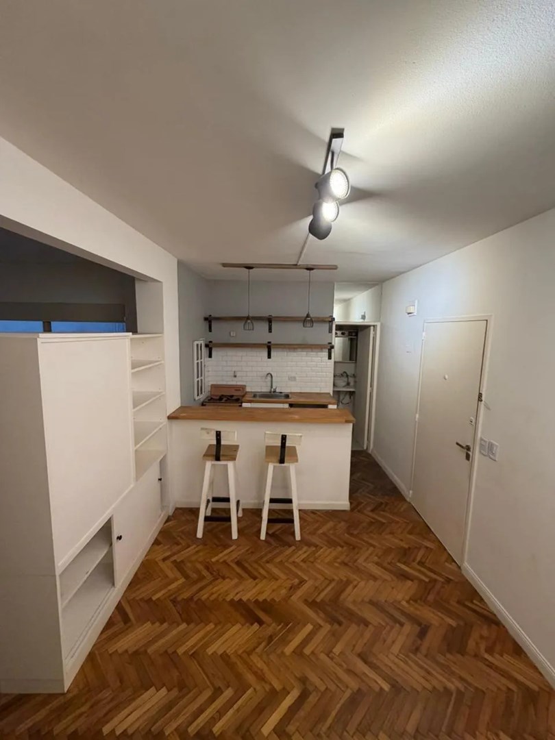 Departamento monoambiente de 25 m2 totales, cocina integrada con barra desayunadora, baño completo y divisor. Edificio de 36 años de antigüedad.