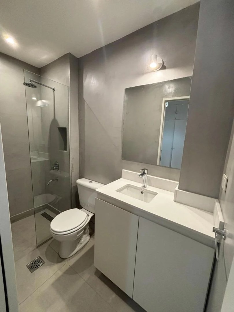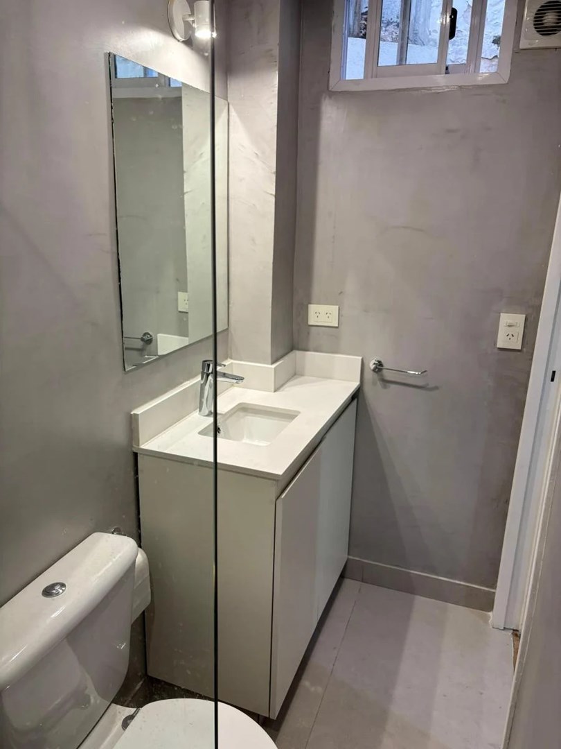 3- Baño de Diseño: Tipo “hotel”, revestido en microcemento gris. Box de ducha con mampara de vidrio de piso a techo, nicho para productos y vanitory con mesada de mármol moderno y guardado.