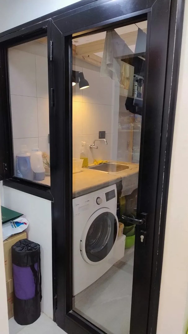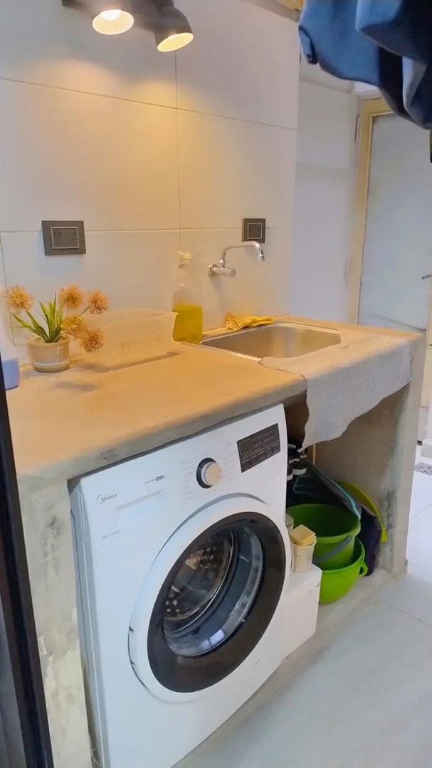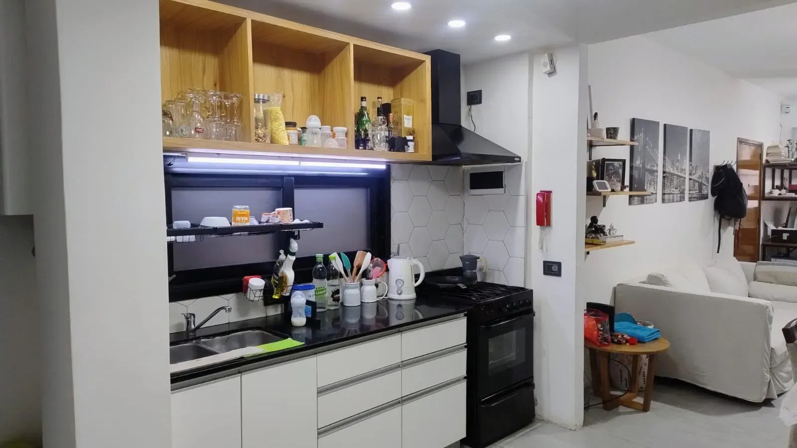 La cocina está equipada con mobiliario moderno, espacio de guardado abierto y bajo mesada, extractor y conexión a gas. Junto a la cocina se encuentra el lavadero independiente, también equipado con mueble bajo mesada y conexión para lavarropas. El departamento incluye una baulera de generoso tamaño, ideal para almacenamiento adicional.