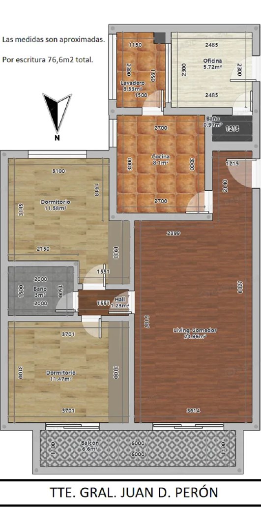 El departamento se encuentra en el 3er piso al frente sobre la calle Tte. Gral. Juan D. Perón. Mucha luz. Total 77 metros2 – 70 cubiertos
