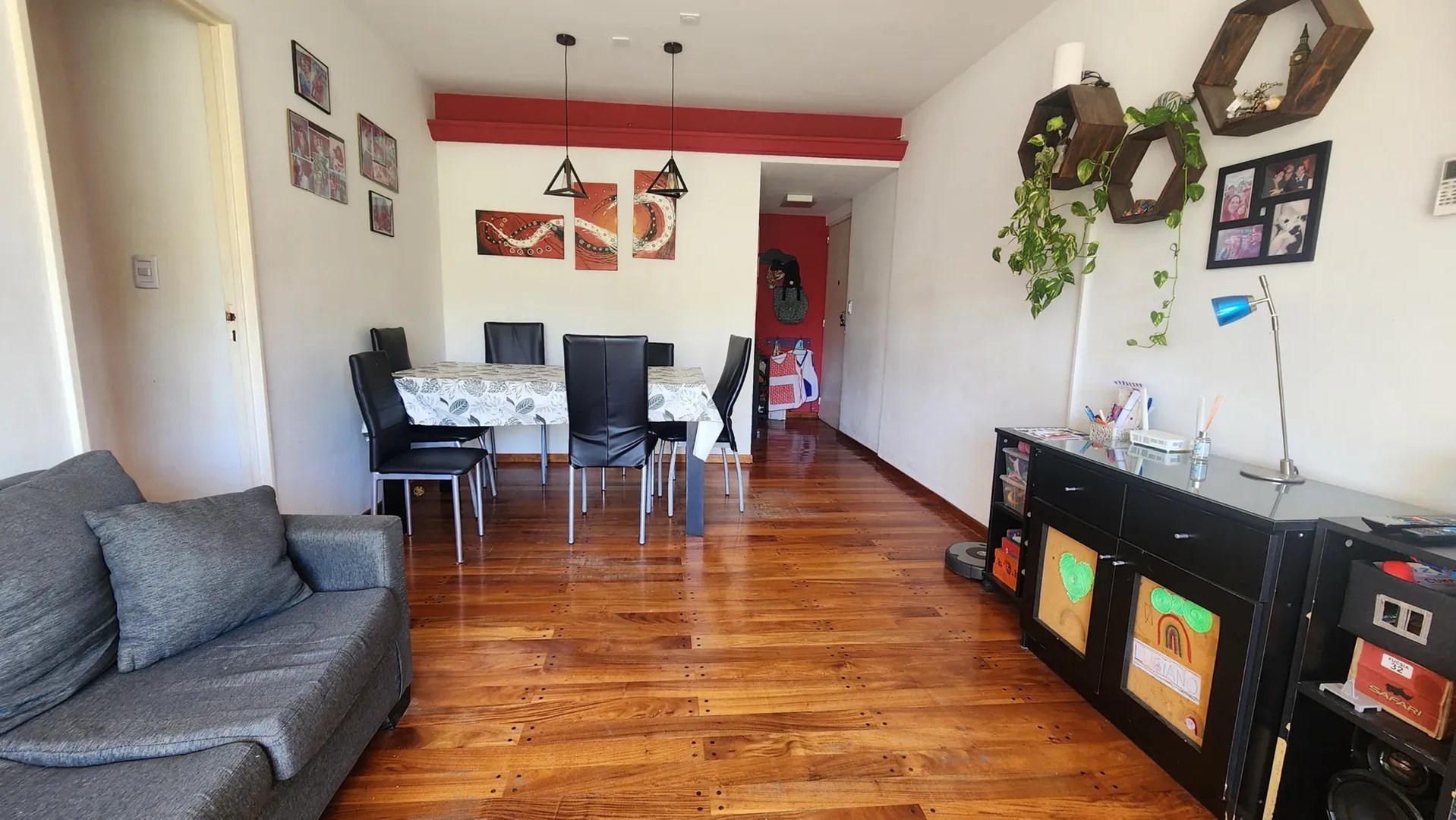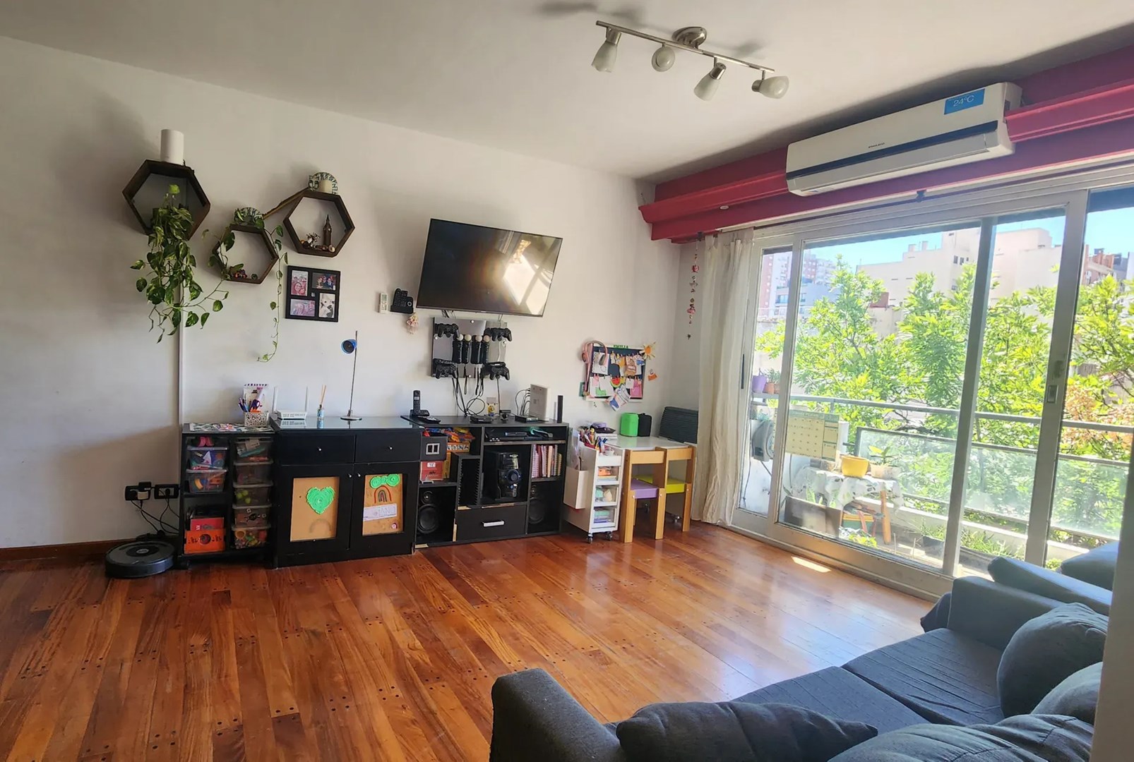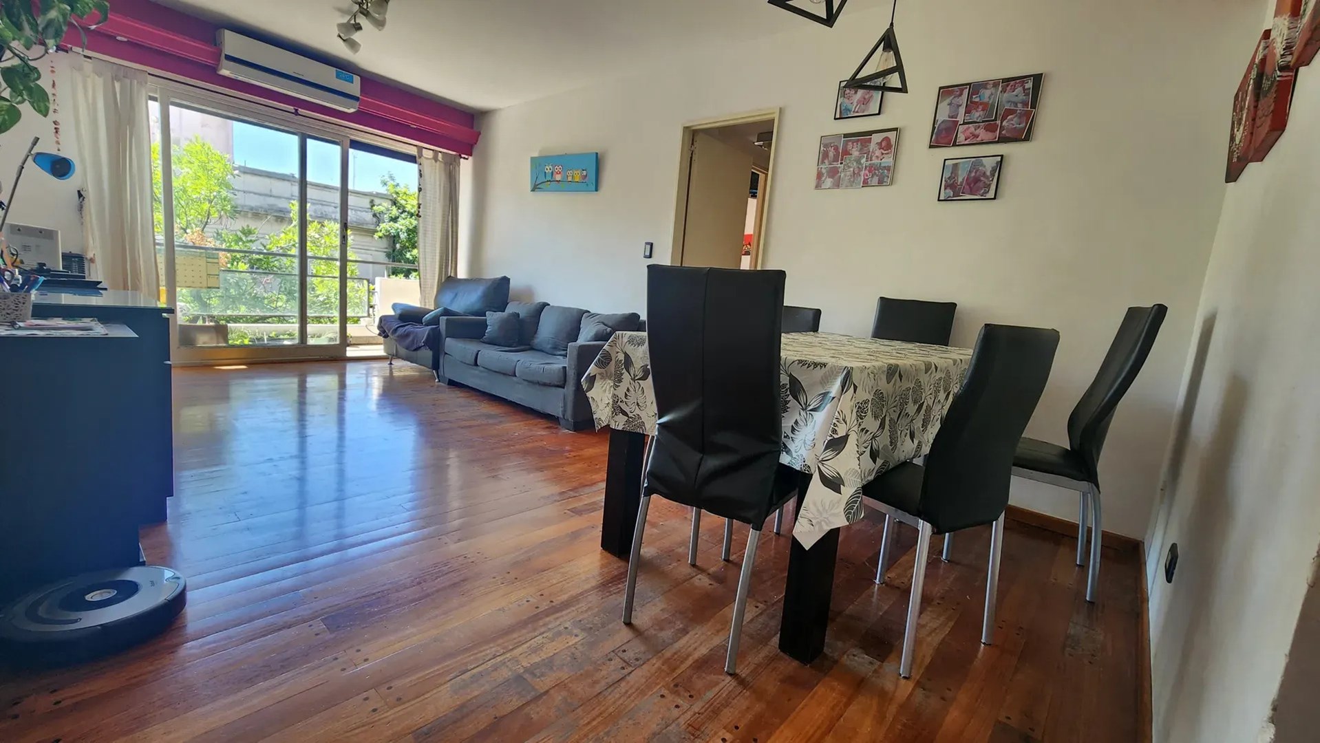 Regresando al hall de ingreso, hacia la izquierda tenemos un amplísimo living-comedor (6,00×3,30m) con gran ventanal al balcón corrido (6,00×1,10m) a la calle con orientación Norte. Este ambiente muy luminoso cuenta con estufa de Tiro Balanceado y Aire Acondicionado. Piso tarugado. El balcón cuenta con conexión de agua y electricidad.