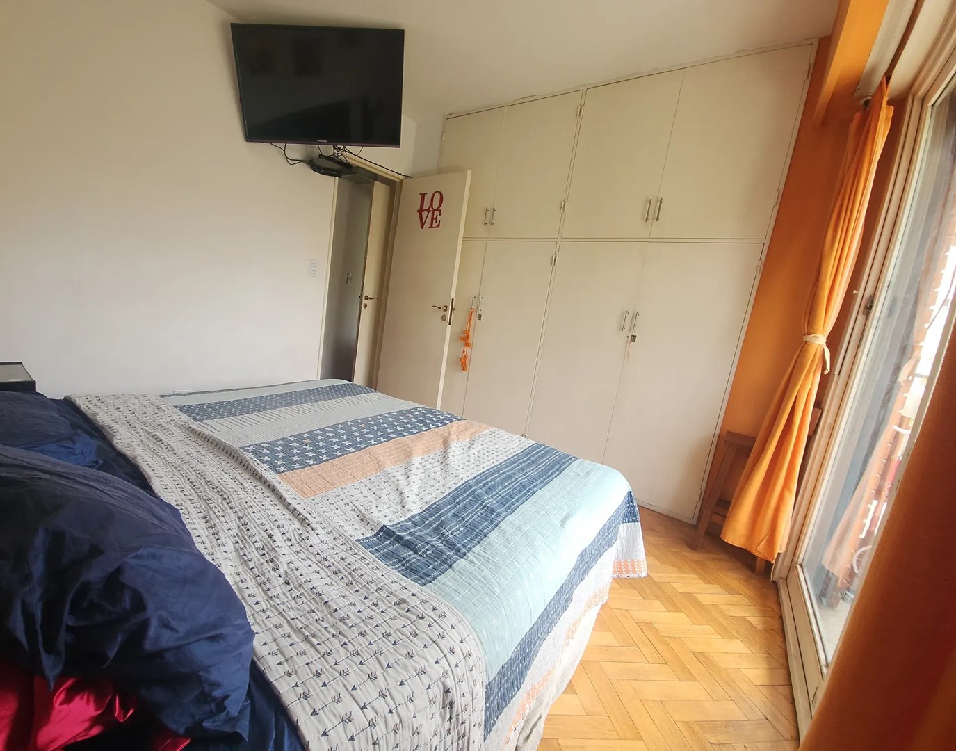 Desde el living comedor, se accede a un pequeño hall de distribución (1,40×0,90m) hacia ambos dormitorios y el baño. La habitación principal (3,10×3,10m) tiene también acceso al balcón, piso de parquet hidrolaqueado, placares empotrados de pared a pared y de piso a techo. Este ambiente cuenta con un Aire Acondicionado Frio/Calor y una placa Ecosol. En las fotos se aprecia una gran cama de Queen Size de 1,80×2,00m, como referencia.