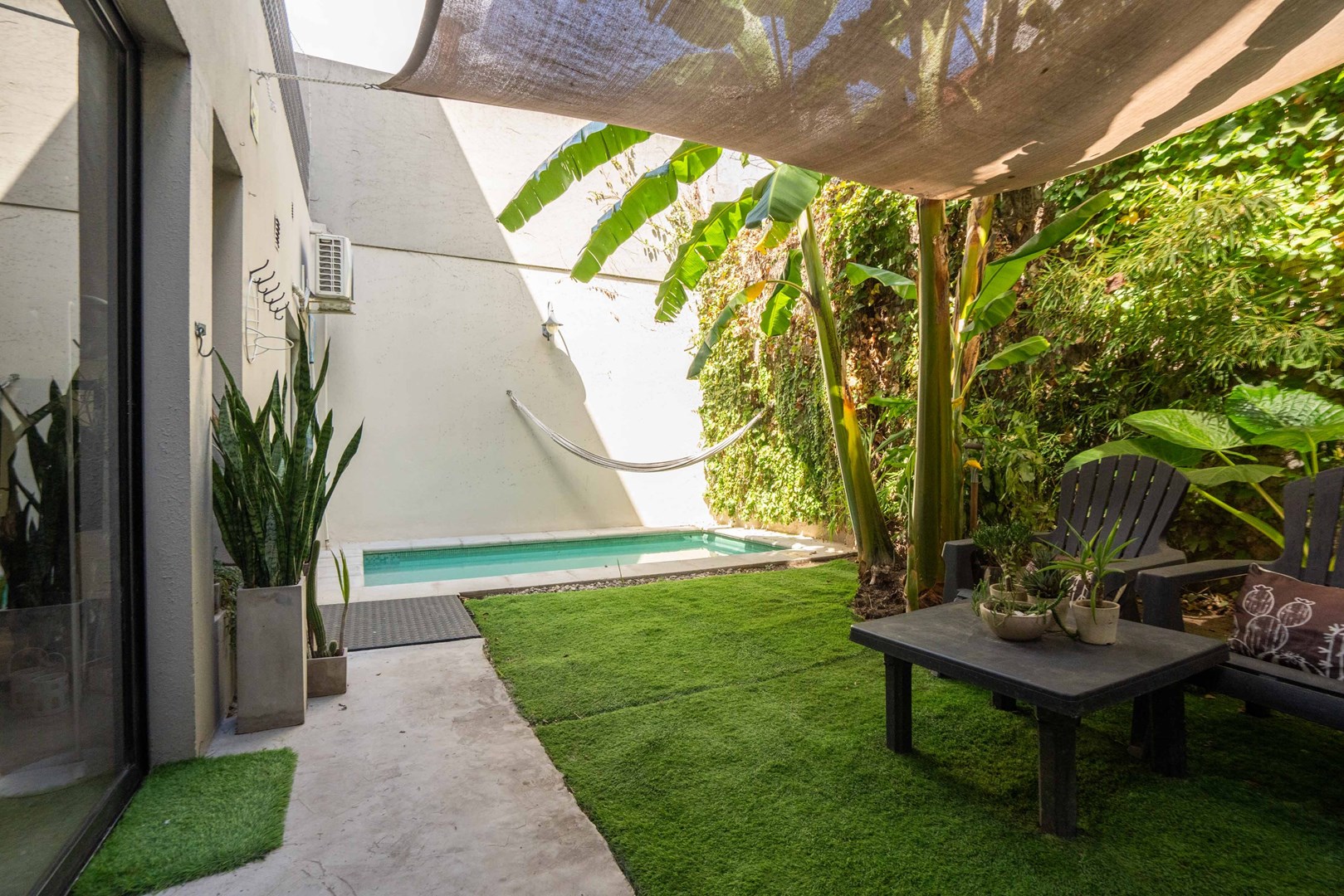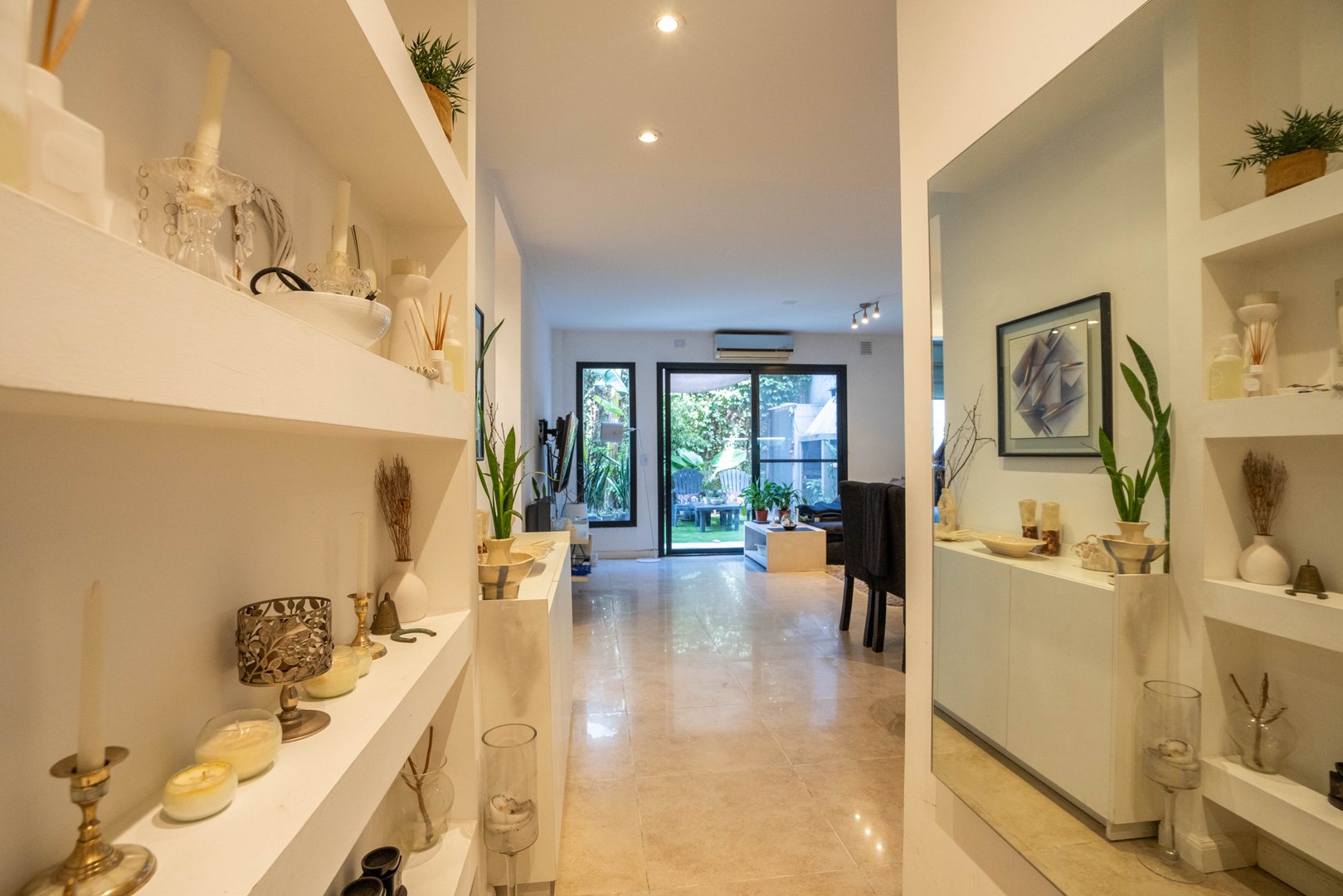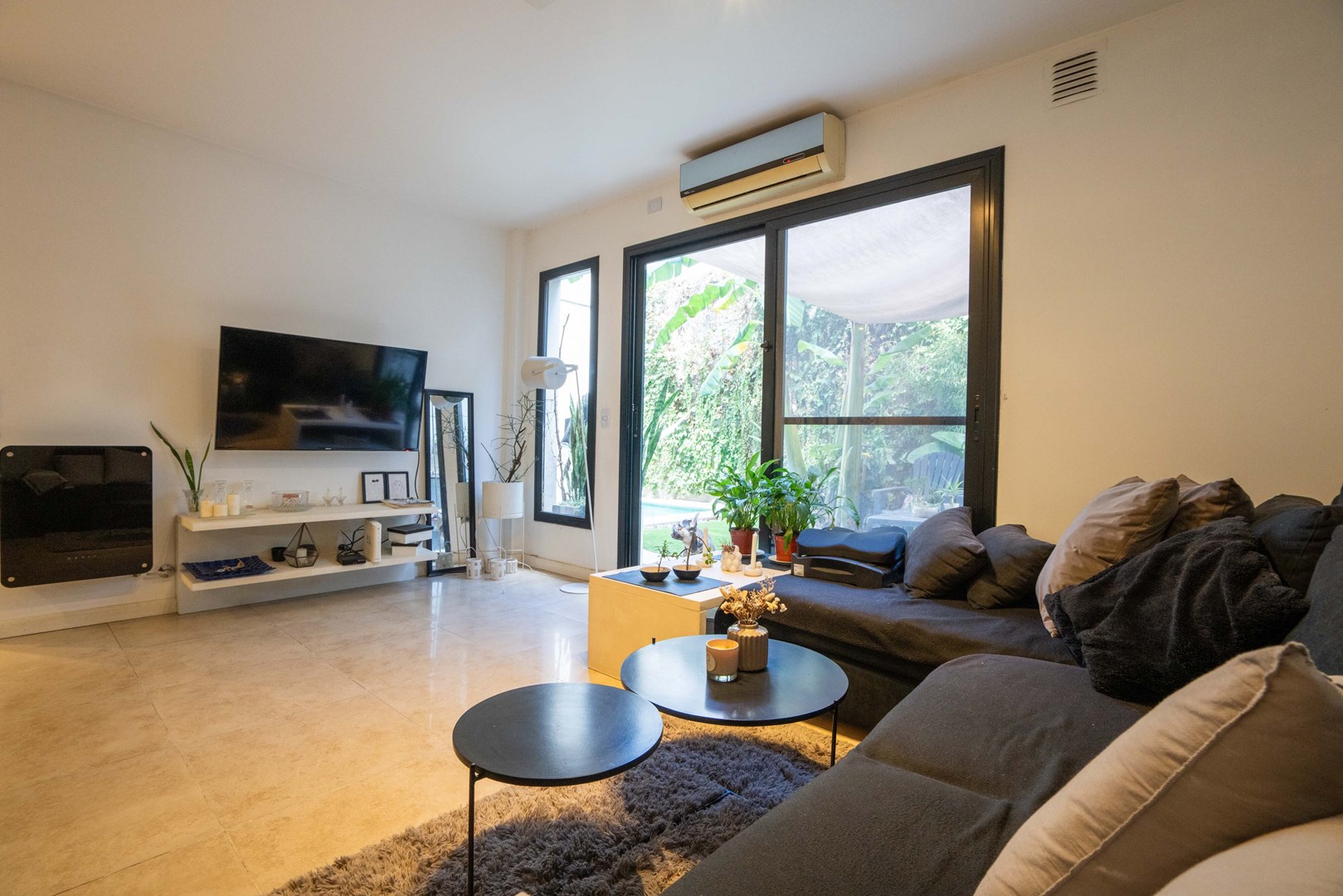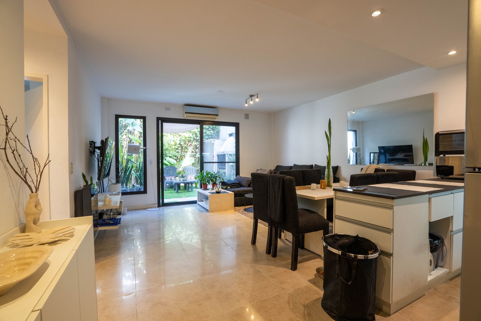 Salida desde el living-comedor a un espectacular jardín propio con pileta climatizada y parrilla.